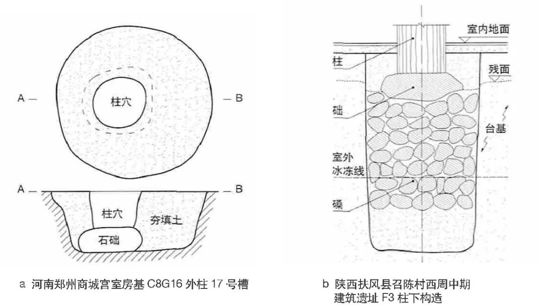 此时,柱子的承载能力和坚实非常重要,从陕西岐山召陈西周中期建筑遗址中柱的基础来看,较商代和周初有很大进步。商时建筑的柱一般深埋于基台夯土内,在柱底仅垫卵石或砾石,有的垫铜锧以隔水汽,如河南郑州市商城宫室的做法,但对承载的要求并不很高;早周的陕西岐山凤雏村宗庙建筑用夯土墙夹柱的方式来固柱,已经比商朝有所进步;而召陈西周中期建筑的柱子,不仅加强柱础还注重稳定,一方面柱础加深了——除了将基坑底部夯土坚实外,还填夹土的大块河卵石多层,并夯实,其上再放大块柱础石承木柱,但柱脚浅埋,这就基本保证基础稳定而木不糟朽的问题(图8),另一方面外围柱子又沿用早周木柱置于夯土墙的做法,这就充分保证了瓦顶加重后的建筑稳定性。