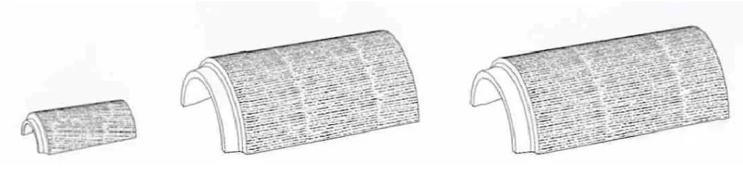 陶瓦起源与发生中,弧形板瓦最早,筒瓦出现略后,约在西周中晚期和东周。陕西扶风召陈遗址出土有大小不等的板瓦和筒瓦,尺度明显较前述陶瓦小。如扶风出土的一件完整板瓦,长46cm、厚约1.2cm,大头宽23cm、小头宽20.5cm,较先前的小些。扶风出土的筒瓦有多种尺度:小的长22.5cm、厚约1.2cm、大头宽13.5cm、小头宽12cm;中等的筒瓦长约45cm、中宽30cm、厚约1.5cm;大筒瓦长约50cm、宽约30cm、厚约1.5cm[7]83(图6),当与不同建筑尺度大小或者等级差异有关。薛城在山东滕县,系周初武王所封侯国,考古的古城宫殿故址出土有筒瓦[13]629;楚郢都三十号宫室建筑遗址出土有大量筒瓦[14,15],相当于东周时期。这时期由板瓦与筒瓦构成的屋面满铺成陇,瓦下使用草泥灰,使得瓦与草屋面结合紧密而更加坚固,也使得屋顶的重量大大增加。