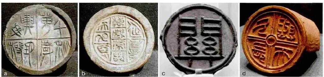 10 秦汉圆瓦当[a“千秋万岁舆地毋极”瓦当,西安博物院藏;b“延寿万岁常与天久长”瓦当,西安博物院藏;c汉函谷关仓库“關”瓦当,洛阳博物馆藏;d“与天久长”瓦当及瓦当构造(约公元前141年),咸阳阳陵陪葬墓园出土,汉景帝阳陵博物馆藏]