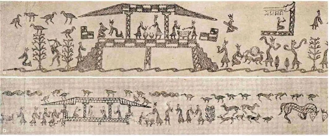 5 战国铜桮内外刻纹表达的栋梁和承托的大斗与柱子(a内壁刻纹;b外壁刻纹)