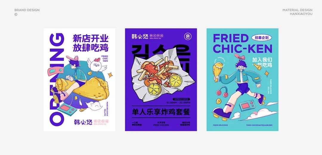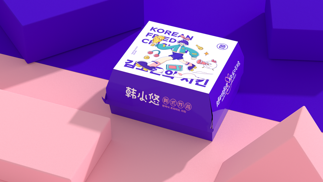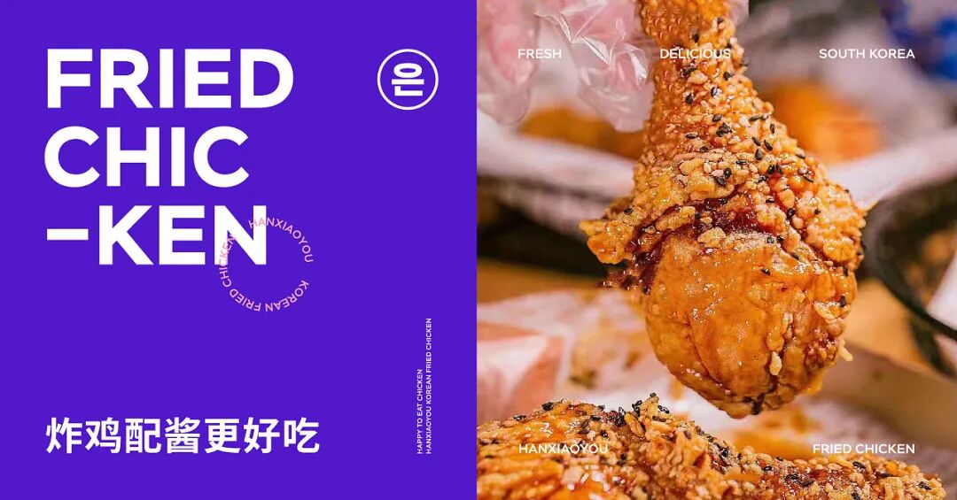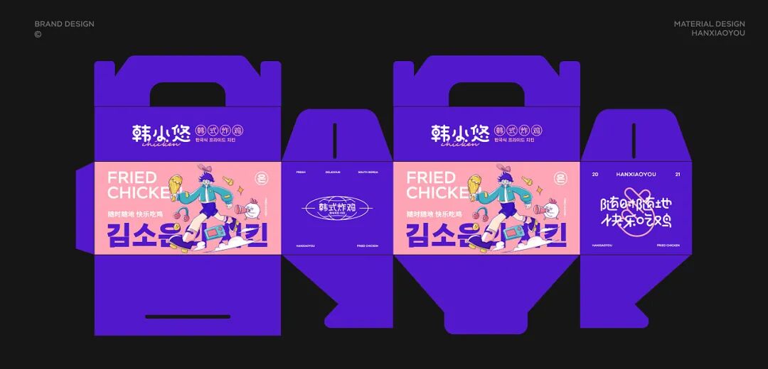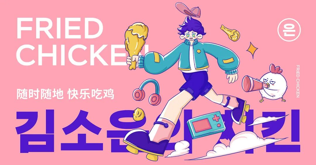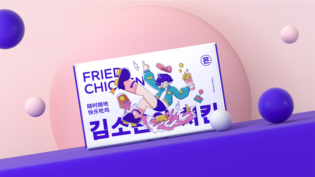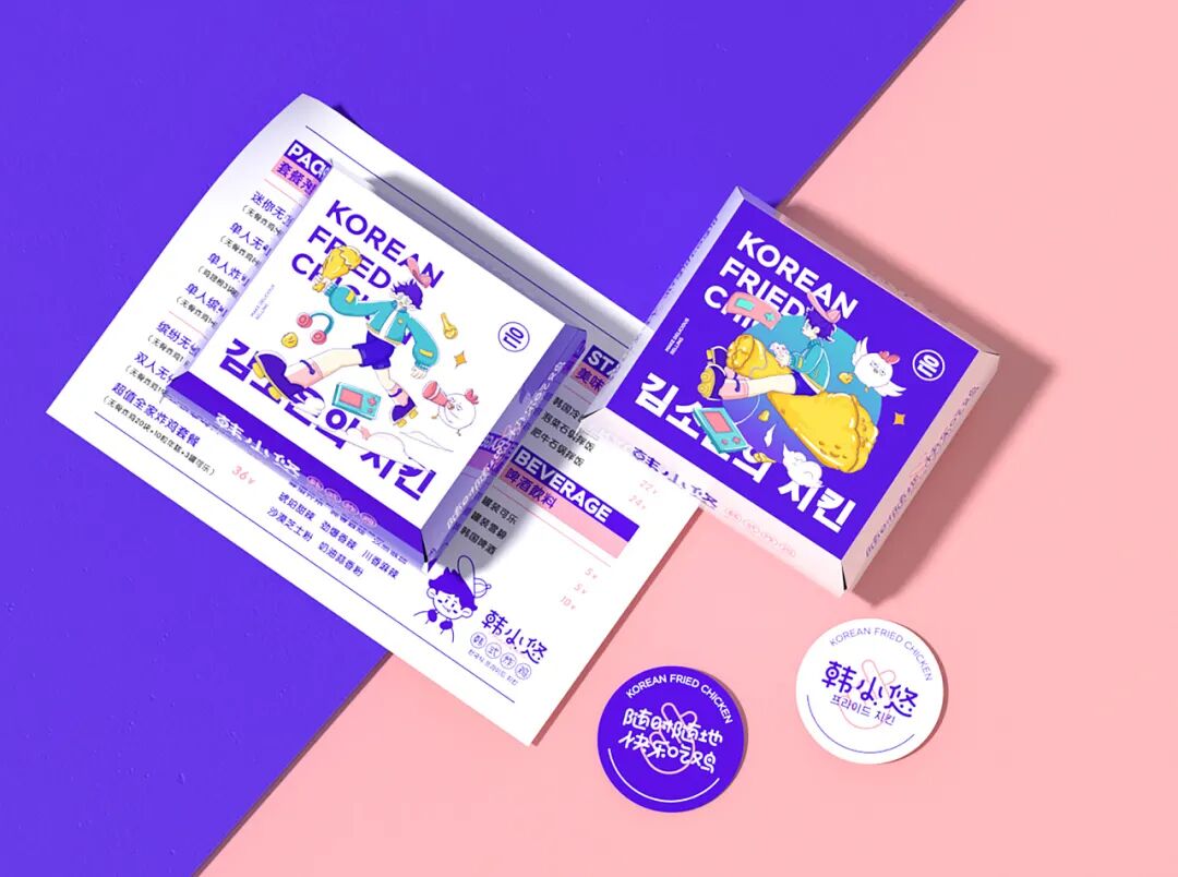 品牌视觉上采用蓝紫色和粉色,打破固有炸鸡大红大橙的刻板印象,让炸鸡更有趣更好玩地呈现在大家眼前,随时随地,快乐吃鸡。