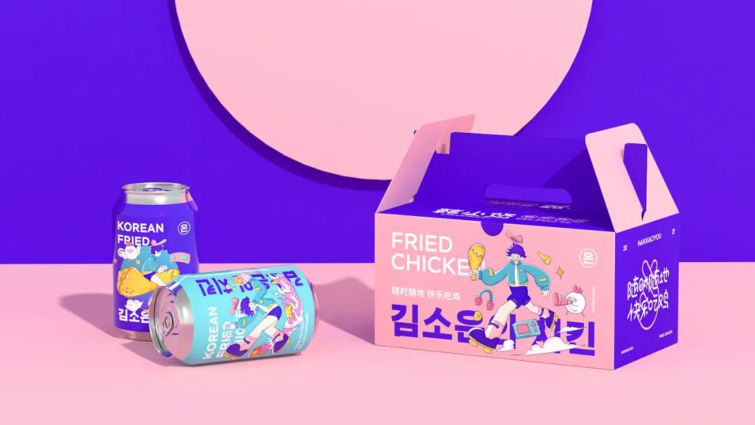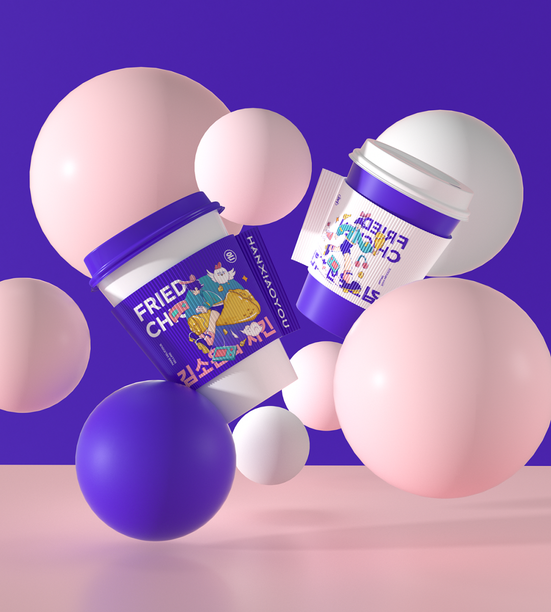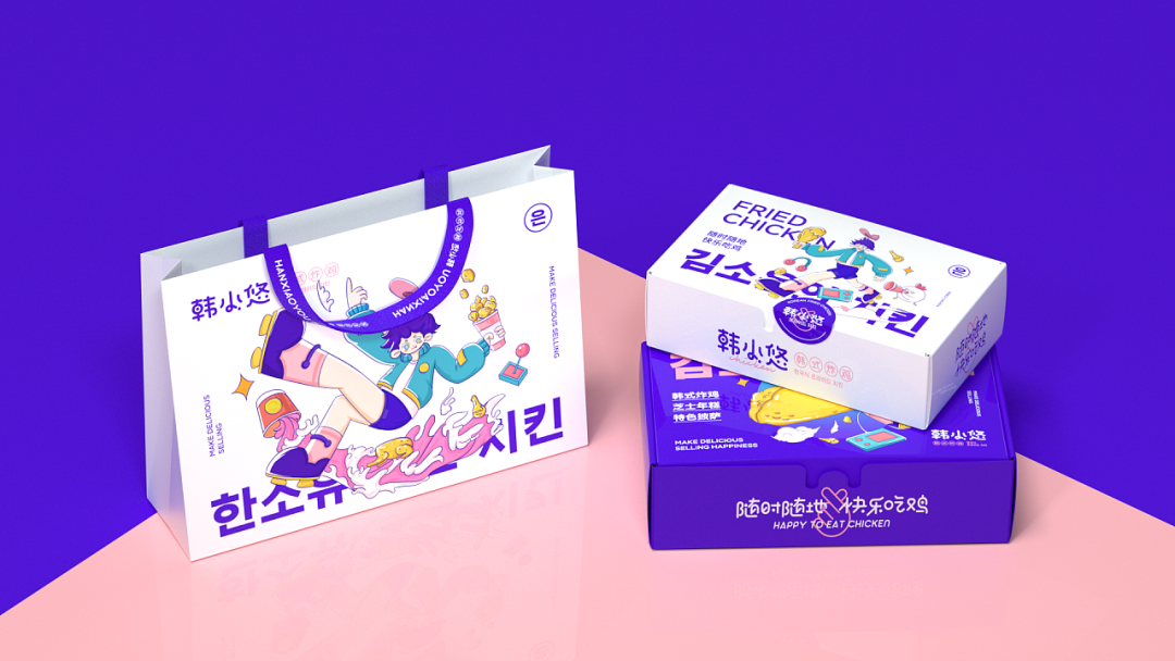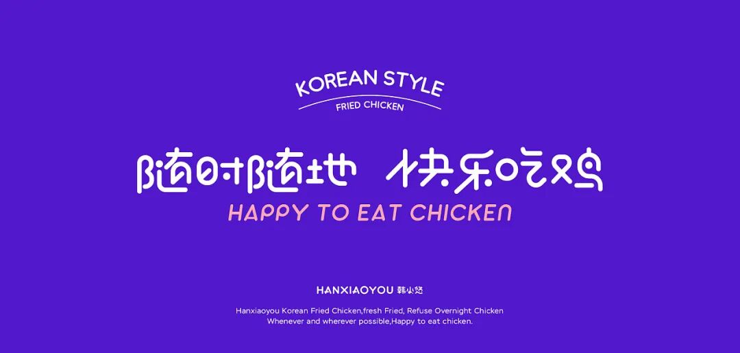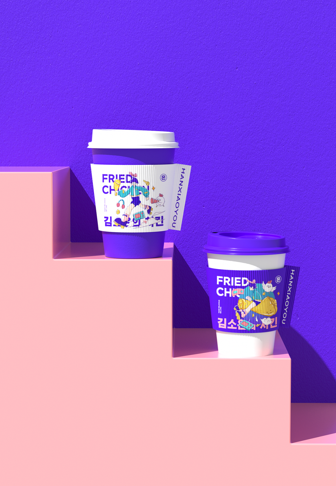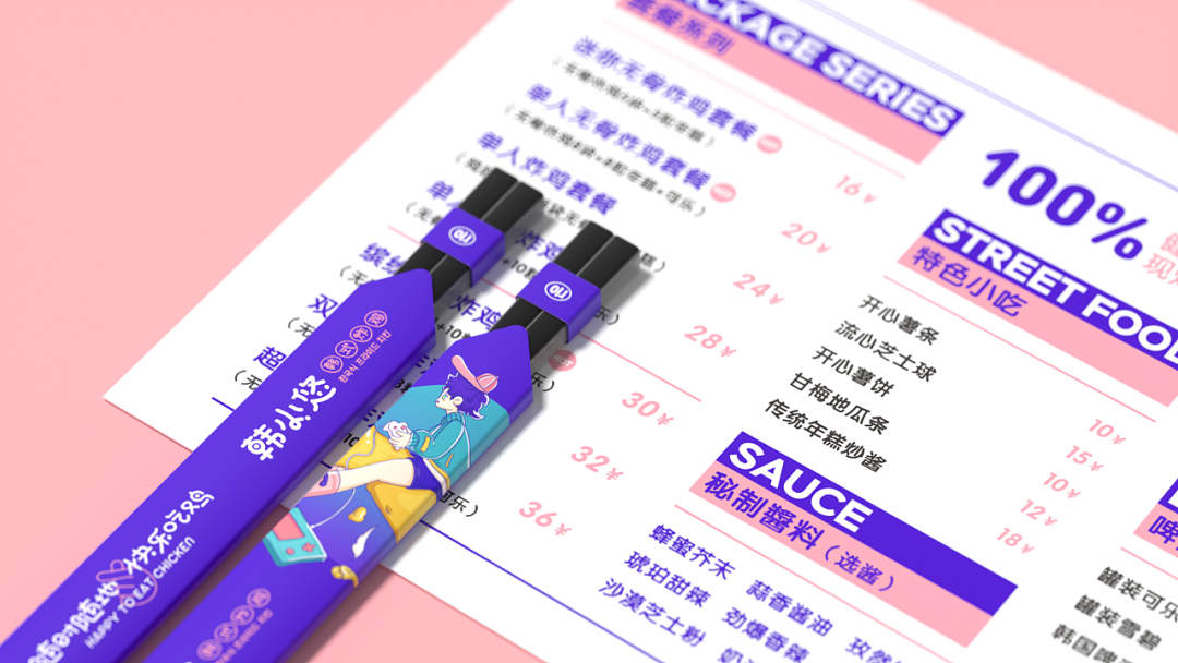 品牌视觉上采用蓝紫色和粉色,打破固有炸鸡大红大橙的刻板印象,让炸鸡更有趣更好玩地呈现在大家眼前,随时随地,快乐吃鸡。
