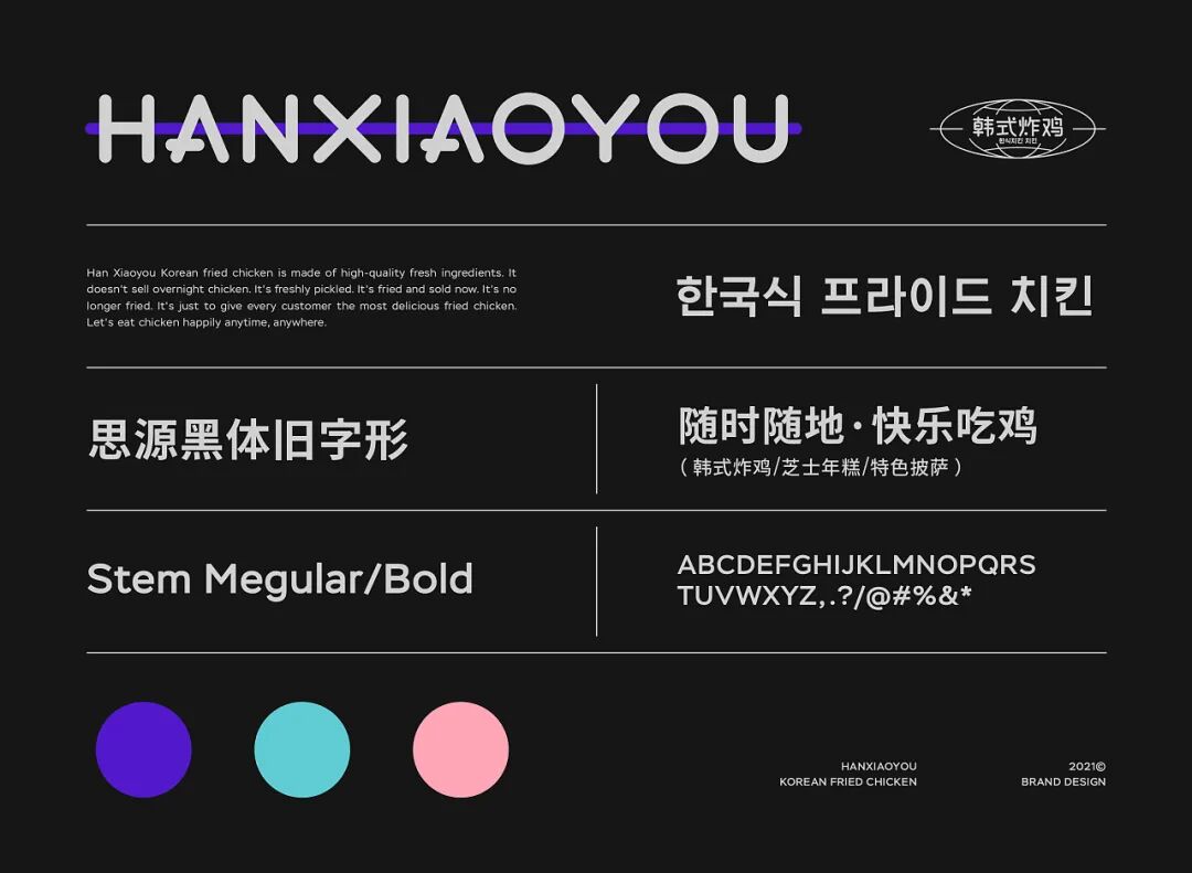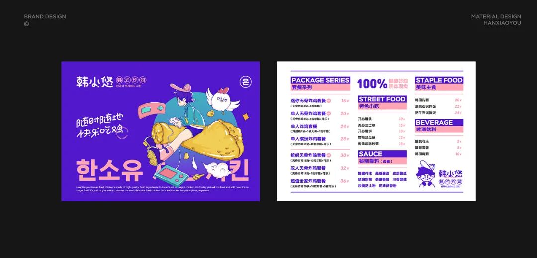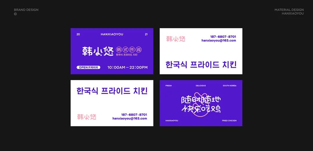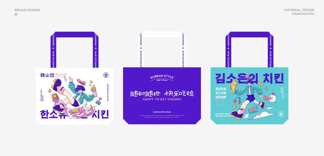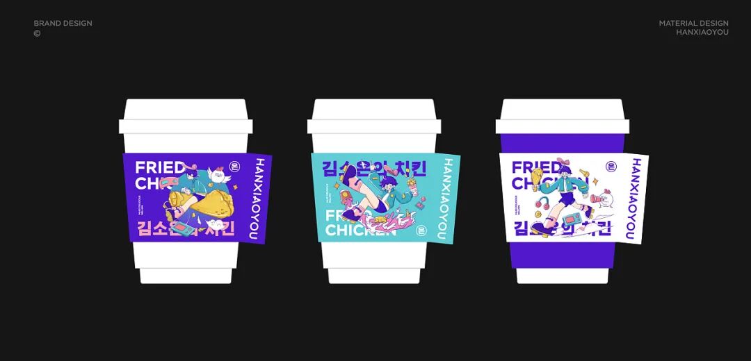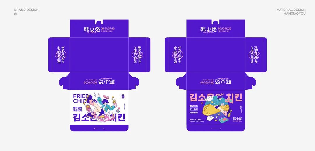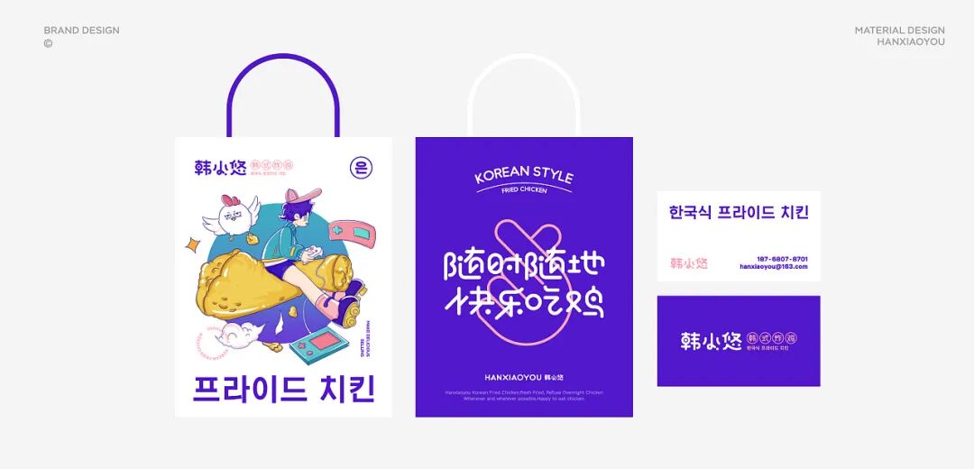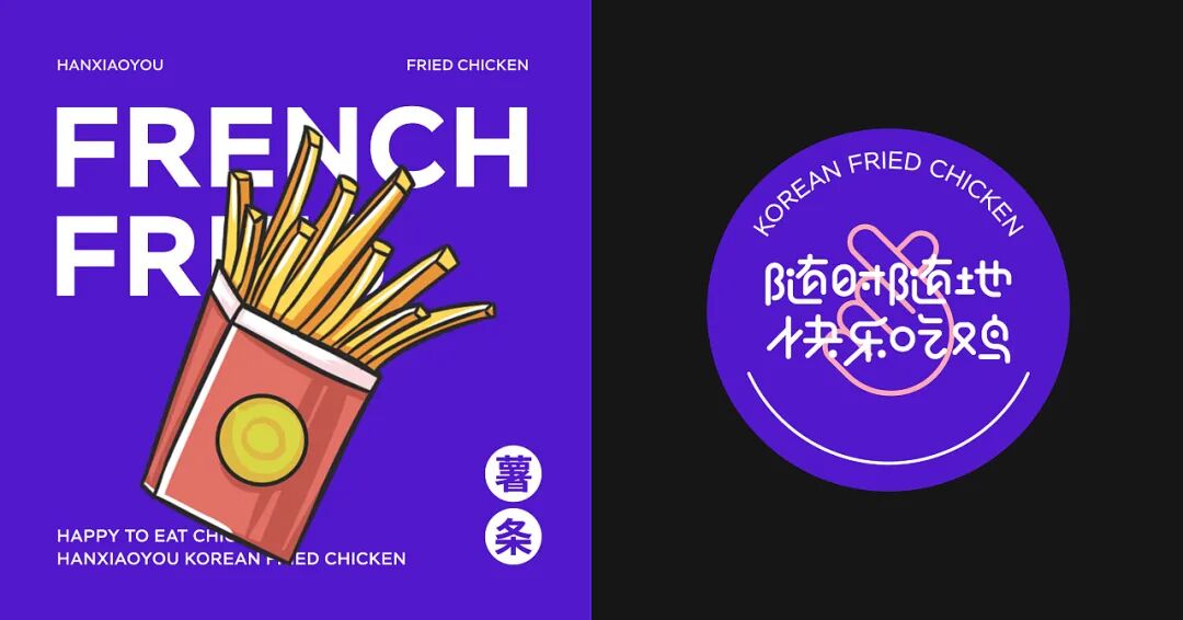 品牌视觉上采用蓝紫色和粉色,打破固有炸鸡大红大橙的刻板印象,让炸鸡更有趣更好玩地呈现在大家眼前,随时随地,快乐吃鸡。