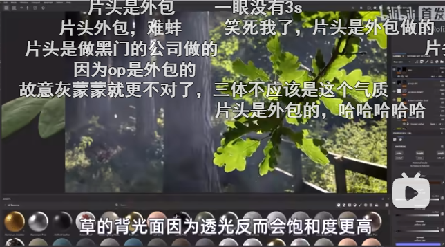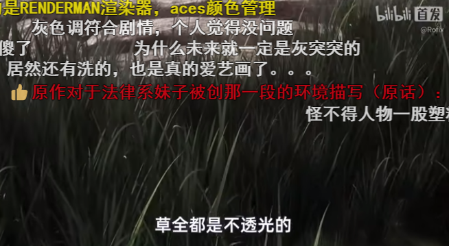 同样的,现实中的植物在阳光直射下的背光面会因为光线的透射,会表现出更高的对比度,但《三体》动画中的草全是不透光的,因此会带给人们一种灰暗质感。