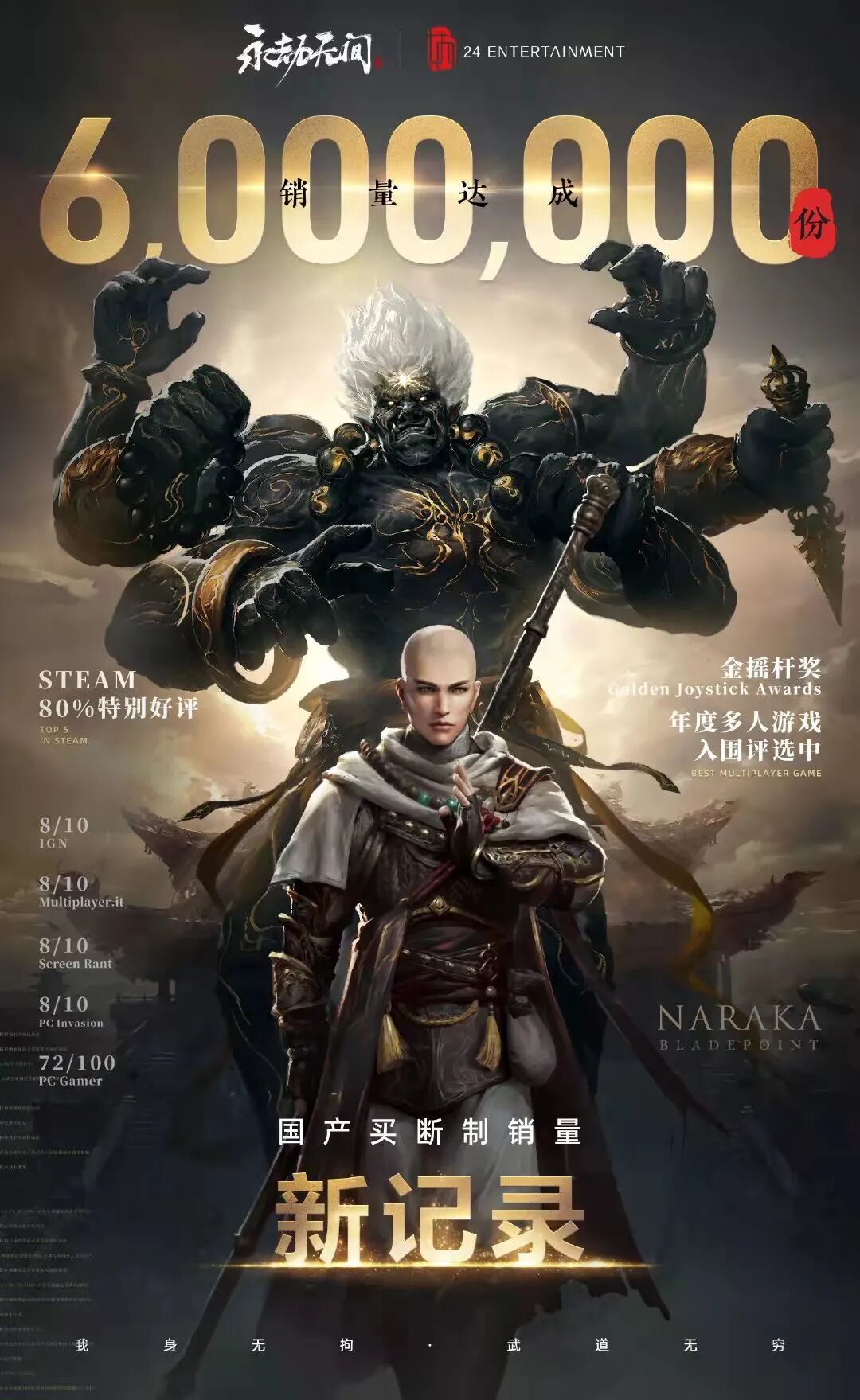 11月10日,《永劫无间》仅仅用了三个月时间,全球销量已经突破600万份,创下了国产买断制游戏销量的新纪录。