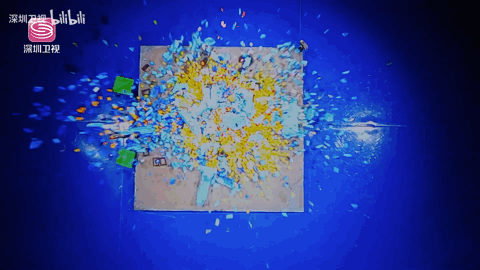 怪兽被摔碎的那一刻,暖色调的方块飞溅。