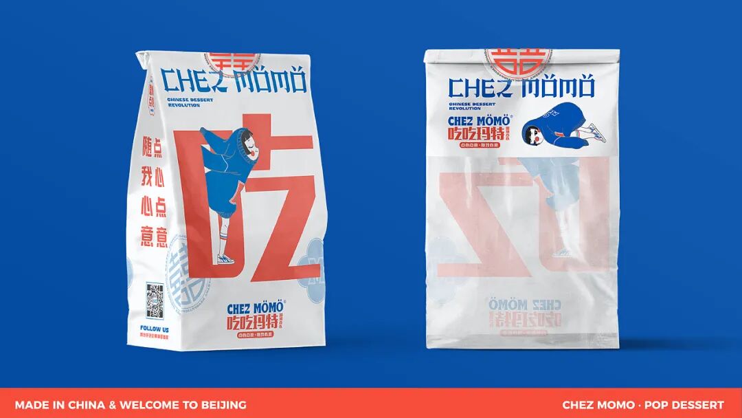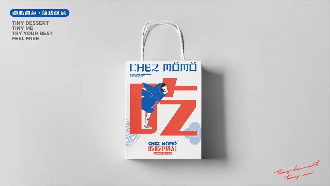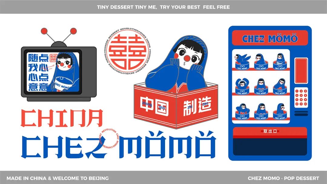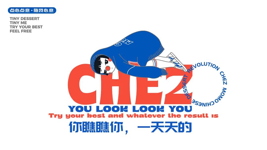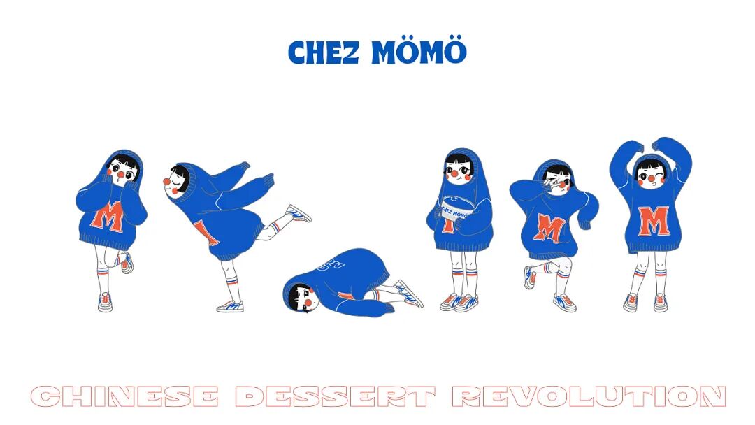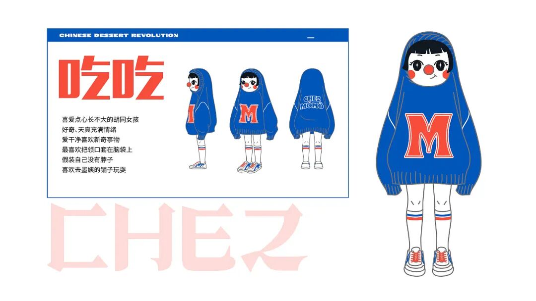 整体形象设计上,新派、有趣之余,还带有中国文化元素。比如LOGO使用了中文笔画解构拼接英文字母以及简单的中文大字报进行组合。IP人物“吃吃”,领子套住脑袋的形象表达“一口套头”;灵感来源于插画家 Miji Lee的番茄酱和蜂蜜芥末,红鼻子则来源于小丑形象,表达崇尚他人愉悦的产品内核。脚步“回力”鞋变体,在人物细节里体现国货当潮。六个动作设定,则使用当下年轻人爱表达的肢体动作。躺平主意的同时热爱着残酷的生活,emo且活力的矛盾体。