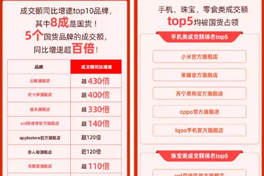 观研报告网发布的《2021 年双 11 国货品牌直播成交图鉴》显示,去年双 11 期间,直播间成交额同比增速 top10 中 8 成是国货,其中同比增速最高的国货成交额较去年增加 430 倍,手机、珠宝、零食类成交额前五名的品牌均为国货品牌。