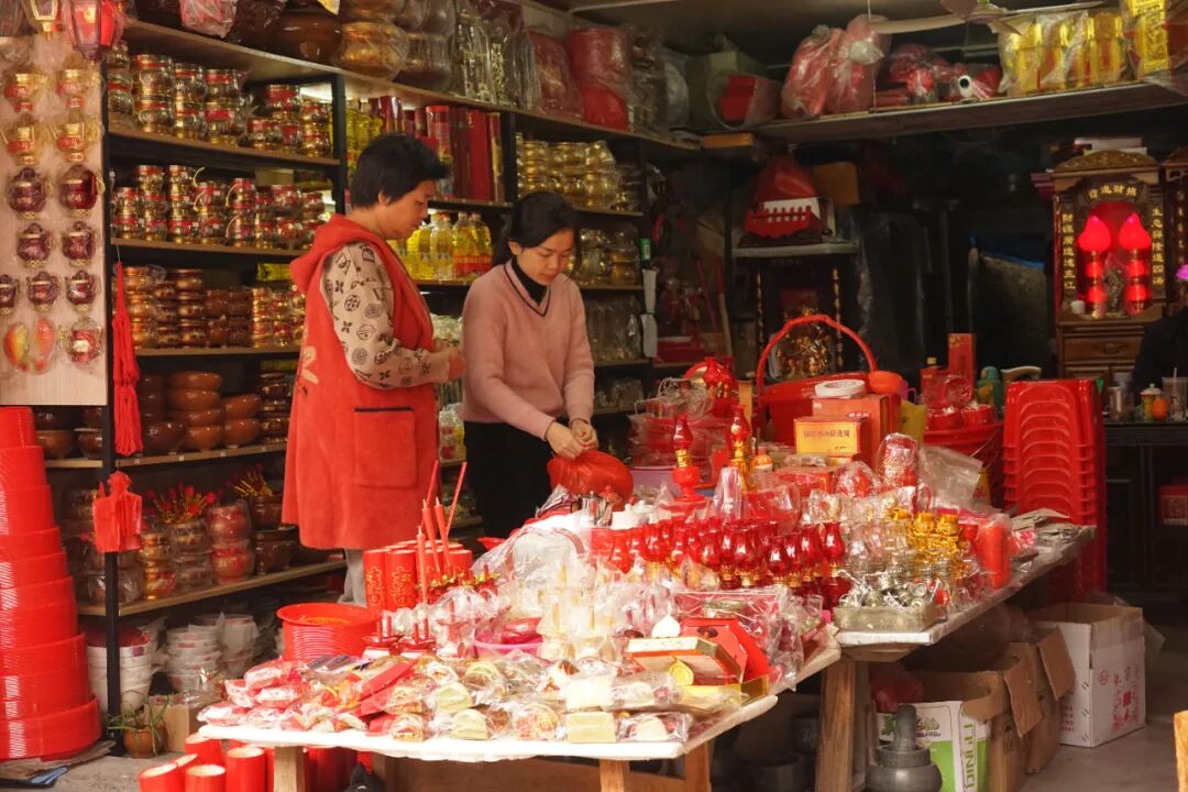 小小的店铺满满当当,红色的塑料碗、香炉、香烛,堆满了供奉用的器物。