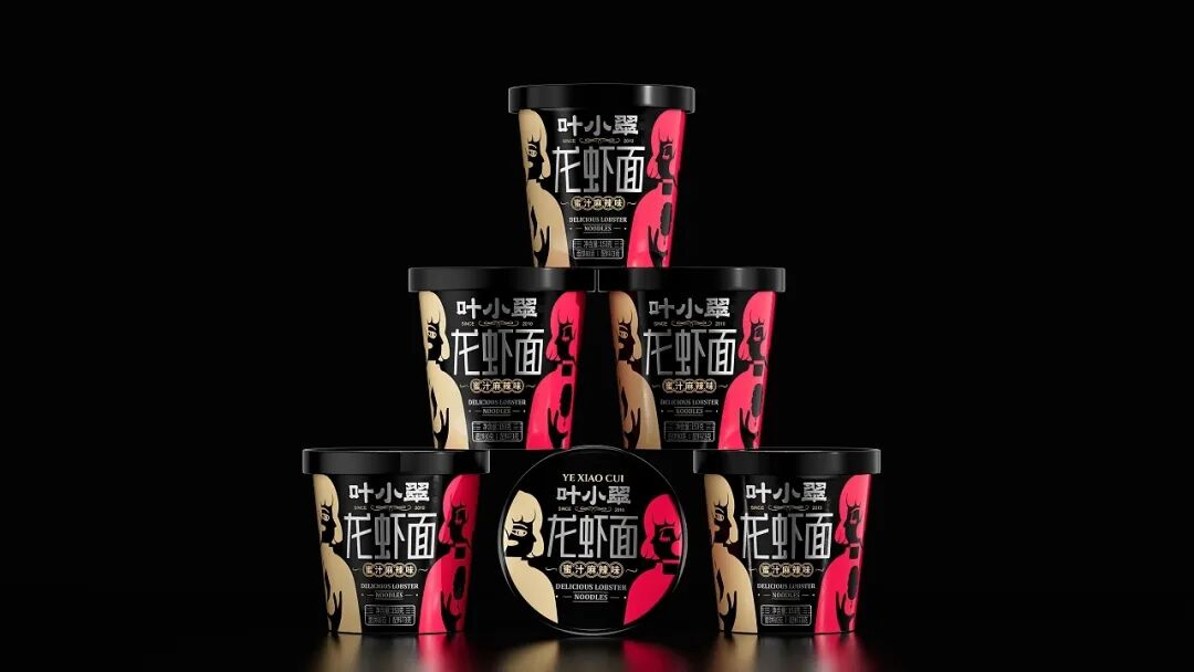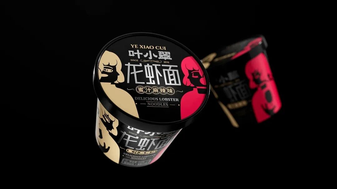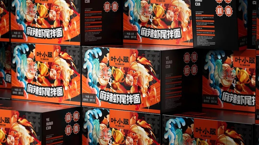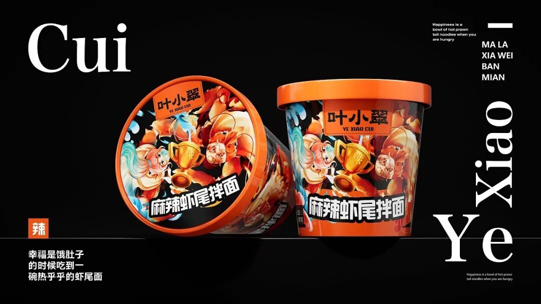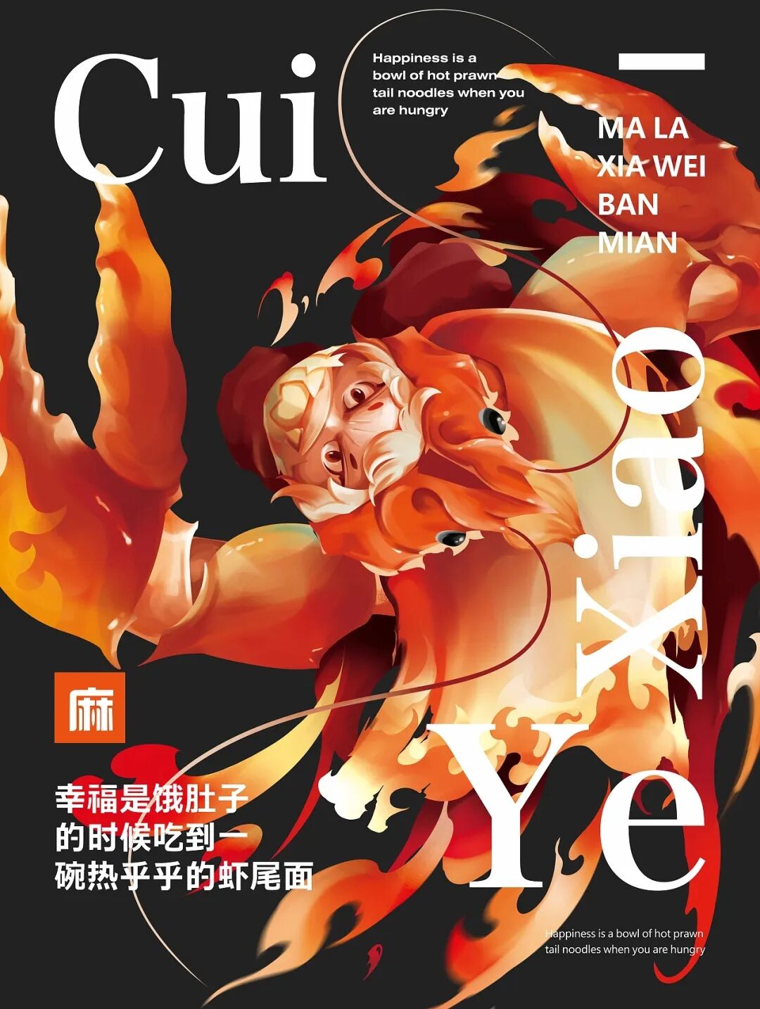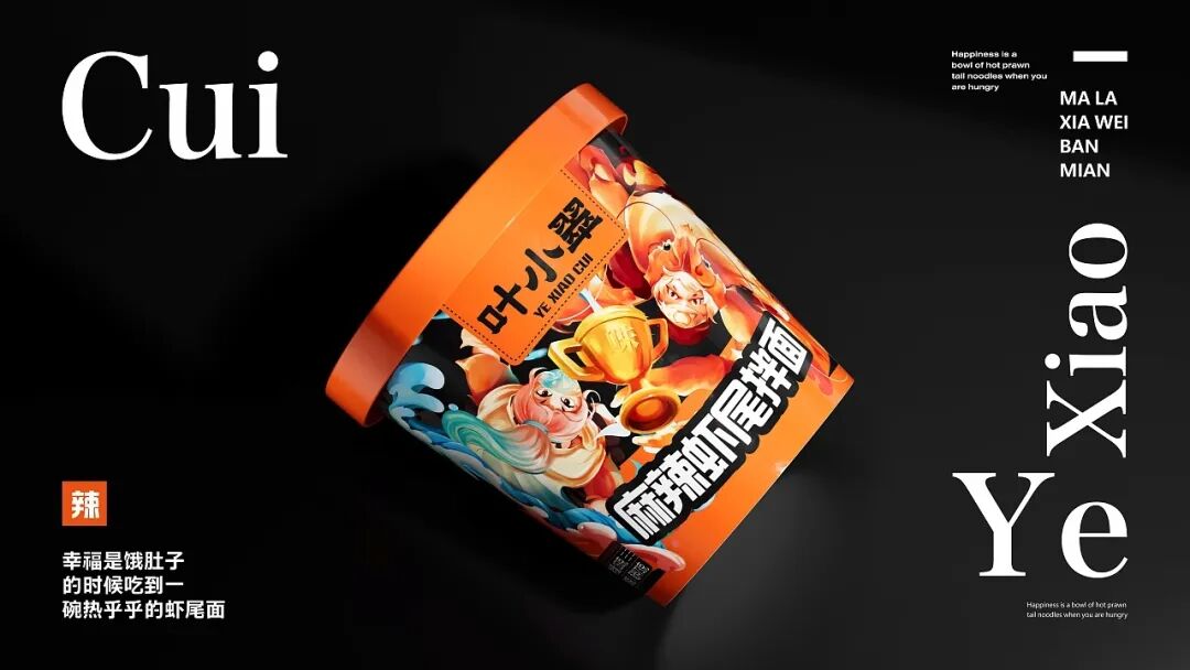 “幸福,就是饿肚子的时候能吃到一碗热乎乎的虾尾面”!叶小翠出品的泡面系列,便以小龙虾为特色,将泡面的香与龙虾的鲜、麻辣等口感相结合,刺激味蕾,让人回味无穷。设计上,整体采用国风插画的形式绘制出小龙虾威严、霸气的一面,辅以传统祥纹元素以及浓烈的色彩,打造强烈的视觉效果。