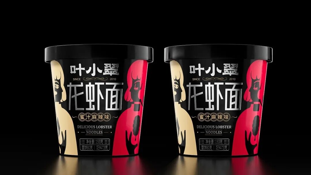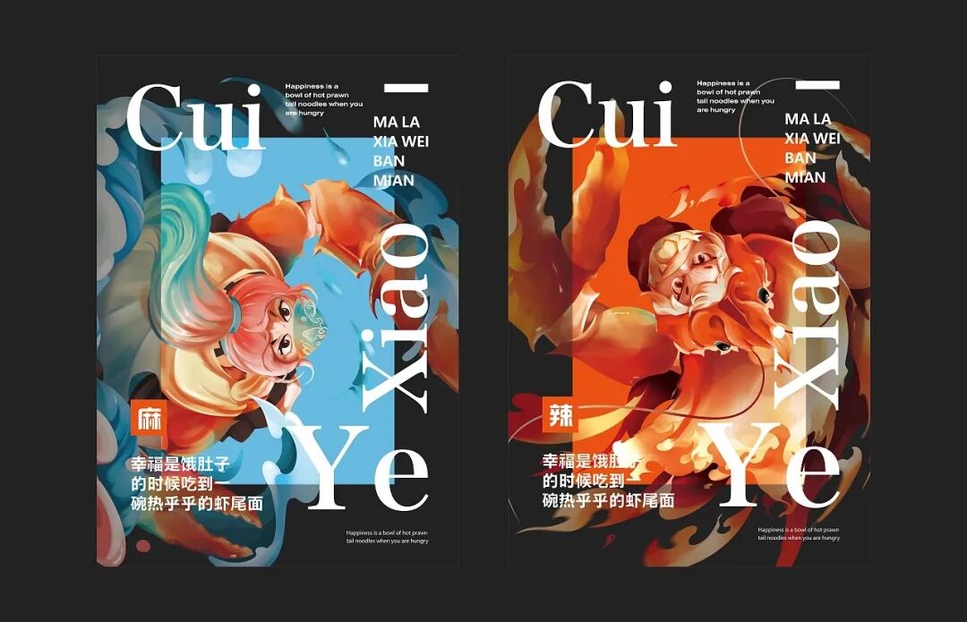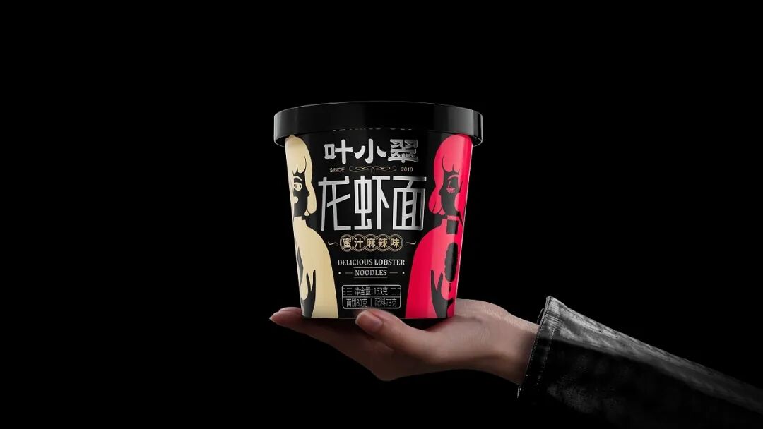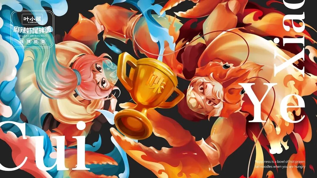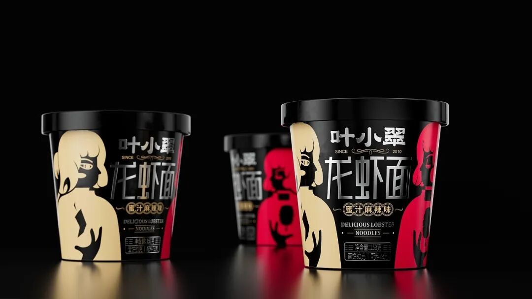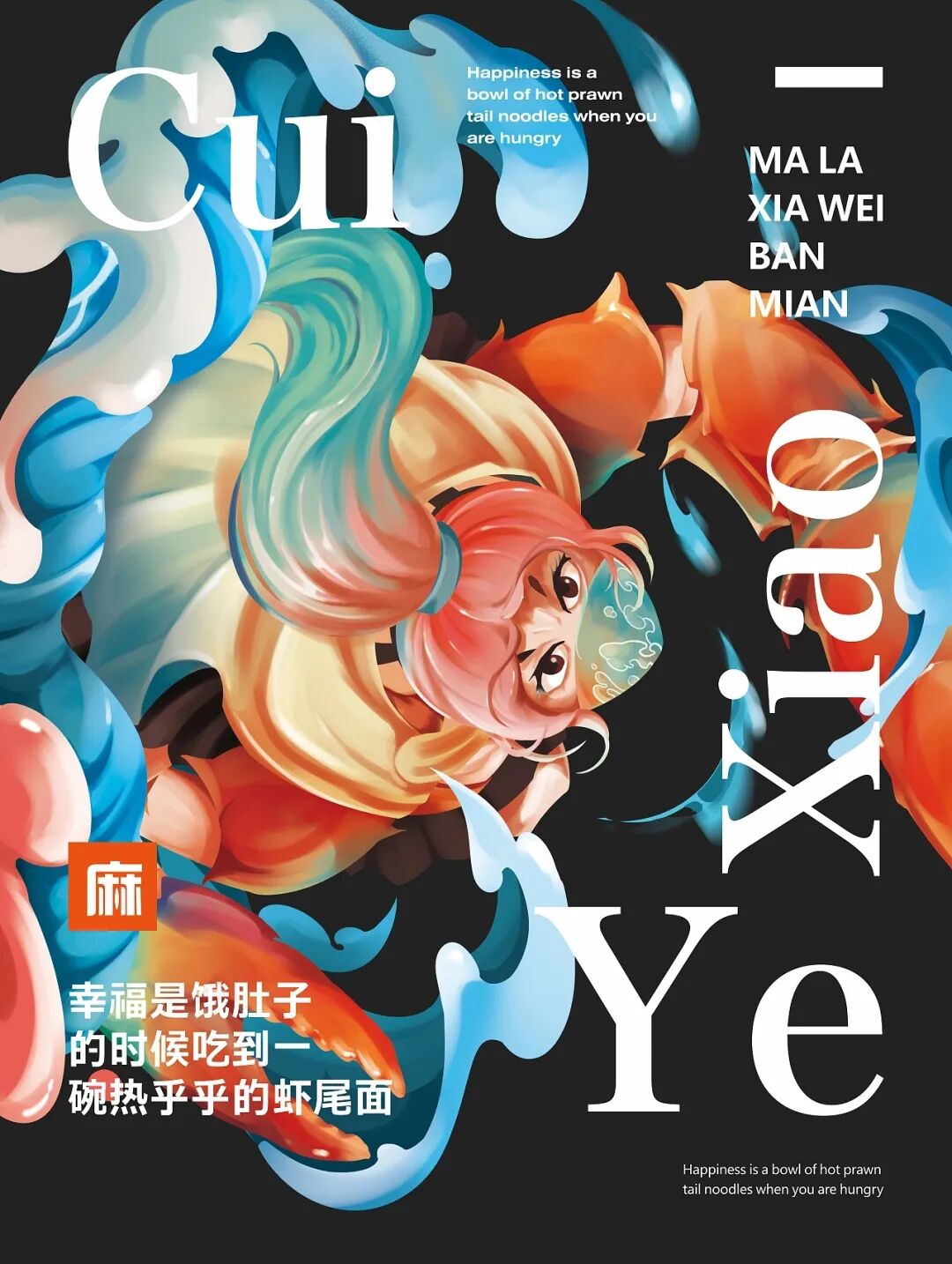 “幸福,就是饿肚子的时候能吃到一碗热乎乎的虾尾面”!叶小翠出品的泡面系列,便以小龙虾为特色,将泡面的香与龙虾的鲜、麻辣等口感相结合,刺激味蕾,让人回味无穷。设计上,整体采用国风插画的形式绘制出小龙虾威严、霸气的一面,辅以传统祥纹元素以及浓烈的色彩,打造强烈的视觉效果。