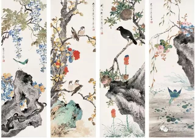 双钩填彩画法是用线条钩描物象後在填色的画法,又称钩 勒填彩法或双钩设色法,是从白描的基础上染色彩而成。它的起源甚早,马王堆西汉墓出土的帛画,已见此种画法,五代 画家黄筌是双钩填彩法的代表性画家,其线条纤细,赋色艳丽 ,是北宋院画花鸟画法的主流,另有江南的徐熙,也用双钩填 彩法,但风格野逸,较注重线条的趣味及墨韵,後世的花鸟画 家 ,用笔多取法徐熙,用色取法黄筌,并兼取两家的神似逸 韵。