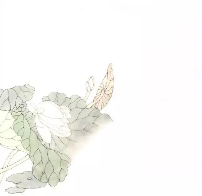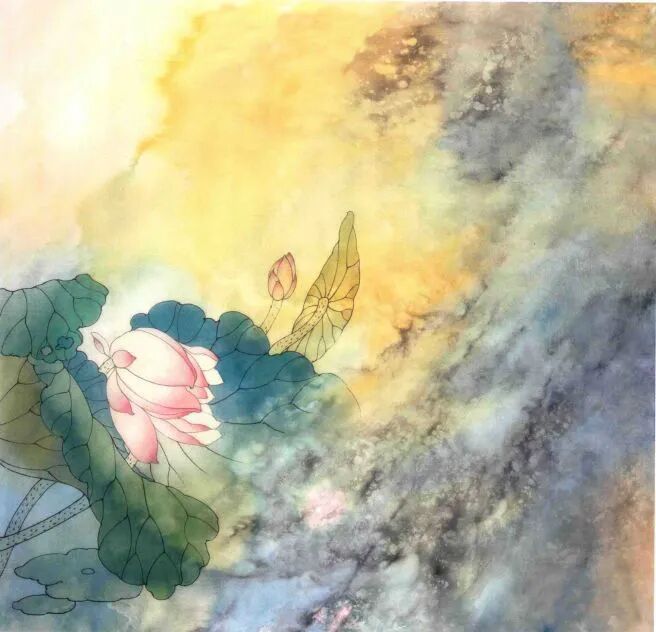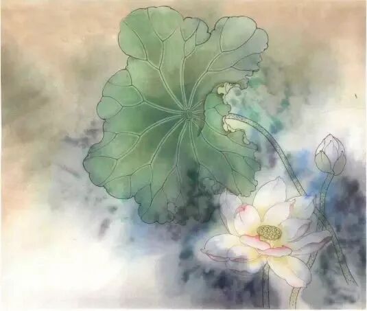 步骤一:勾好花叶之后,先进行初步分染。这时染色比较淡,只染出大体关系。待颜色干后将画面打湿,用赭石、墨、石绿、花青、胭脂等色泼彩。为突出粉色荷花,在花的周围用色较深,荷叶之上逐渐淡去。画面整体颜色布置也要注意考虑构图布局、留白等。↓↓↓