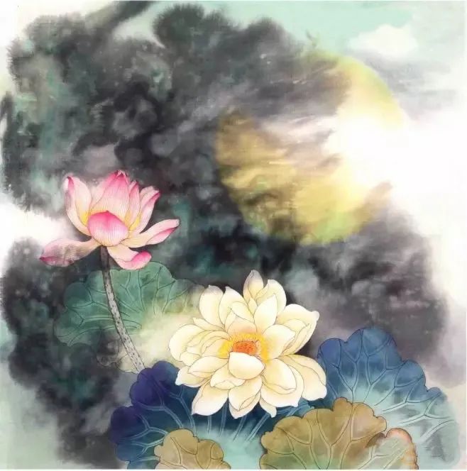 步骤一:淡墨勾花,中墨勾叶子和花茎。白色平涂荷花,胭脂和淡赭墨分染浅粉色和白色荷花。花青加少许酞青蓝分染中间的茶叶,花青加藤黄分染后面的叶子,调淡赭绿分染反叶。用藤黄、墨和石绿进行泼彩。藤黄只染出月亮的形。↓↓↓