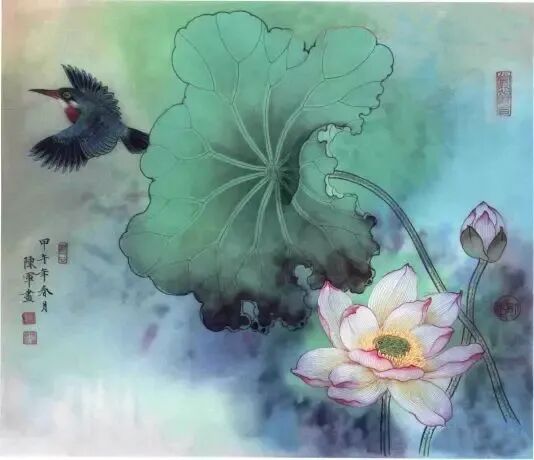 步骤二:继续分染花头和荷叶,白色勾花脉。画面整体色调不太统一,因此调酞青蓝加石青烘染整个画面,染出荷塘清凉的感觉。添画翠鸟增加气氛。↓↓↓