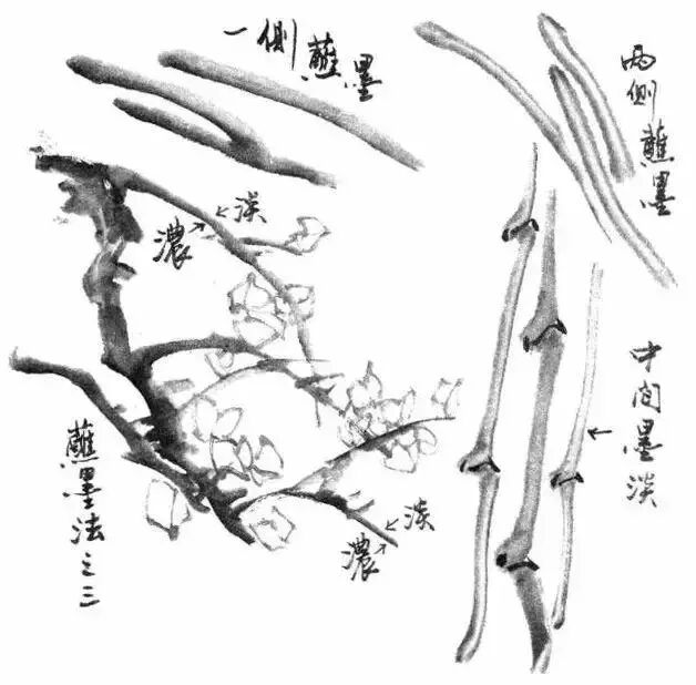 笔侧蘸墨:先蘸淡墨并将笔头轻轻压扁,然后用一侧或两侧蘸浓墨,画出的线条是一边深一边浅,或两边深中间浅。常用一侧蘸墨的方法画枝干、藤蔓,用两侧蘸的方法画竹竿等。