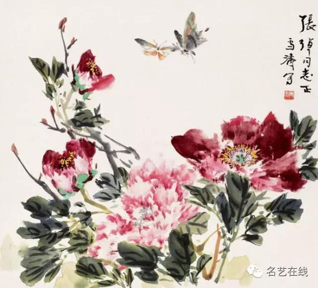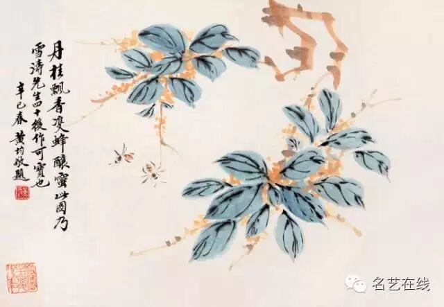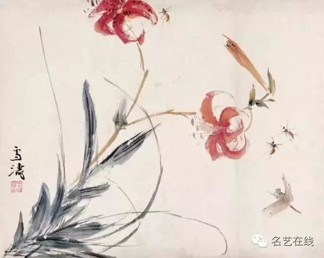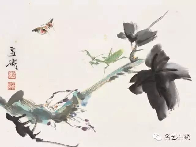 中国画的色彩表现与西洋画全然不同,虽说谁都了解中国画以表现对象固有色为主,问题就在于如何巧妙利用自然对象的固有色来丰富画面。西洋画中总结的色彩规律对了解这一点是有帮助的。白色的玉簪上落上一个瓢虫,活跃了过于淡雅的色调,对比之下也更增添了花的晶莹。生就有着两种颜色的螳螂,在一幅画上为赭黄色可能更谐调;另一幅中,画成石绿色,则在对比之下可能更突出。色彩的巧妙运用可以为画面增添音乐感和韵律。我画过一幅“鸢尾”,其上补什么飞虫,颇费不少脑筋,主要从色彩上考虑,添加了蜡蝽才觉比较满意。整幅画是所谓偏冷一些的温色调,比较明快、淡雅,同时又不过分地使用了对比,造成统一而悦目的效果。整体色调是由画在泥金底上的草绿和青紫的花形成的,而花头与飞虫的红翅造成对比。同时青紫、灰红、黄绿三种色调又能协调为一体,色彩感觉就丰富些。借助外国的色彩经验,用来丰富以表现固有色为主的传统技法,我看很值得钻研。