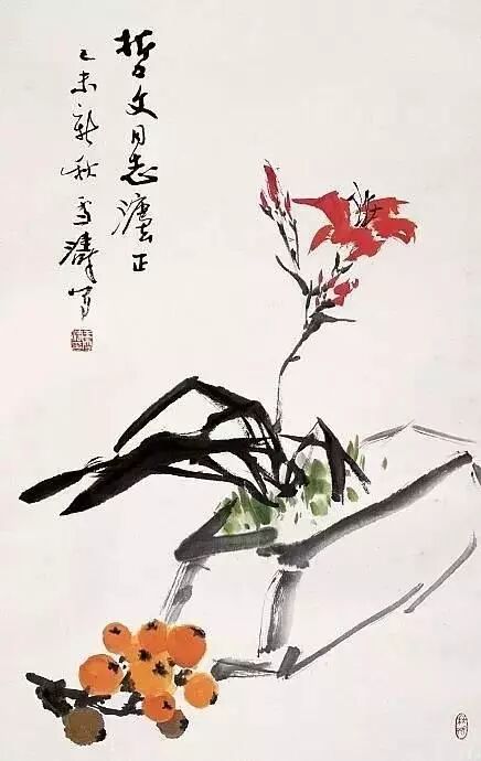 齐白石以浓墨画白菜,旁边并列两个带有黑蒂的深红小辣椒,色彩感觉十分鲜明。他画的黑白蜡台,插上红色蜡烛有着同样的效果。红黑二色产生的艺术感染力,古代人就很熟悉,如中国的漆器、希腊的瓶画。它有鲜明的对比,而又庄重饱满。我自己也有一些感受。牡丹是人所喜爱的一个花卉品种,唐代人赏牡丹成了长安、洛阳的一大风尚。历来文人、画工以此为题写诗作画的很多。然而封建文人是把它作为富贵象征来描绘的,今日人民对它的爱好、感受全然不同。我曾试以墨色描画枝叶,衬托红色花头,突破了红花一定要绿叶来扶的格式,除却了柔媚富贵之气。用色虽然减少,但整体效果突出而庄重;运用得好,色彩感觉未必是单调的,同时也更能在枝叶上发挥笔墨效果。