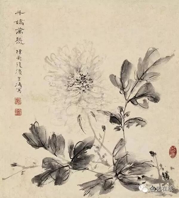 水渍:落墨后水渗出墨外,再接第二笔,第一次落墨渗出的水,将第二次落的墨排斥开,两笔之间留出水迹。渗出的水迹越宽,水渍效果越明显。常用此法画花冠、禽鸟羽毛等,用墨时要一笔笔画上去,不可反复涂抹。