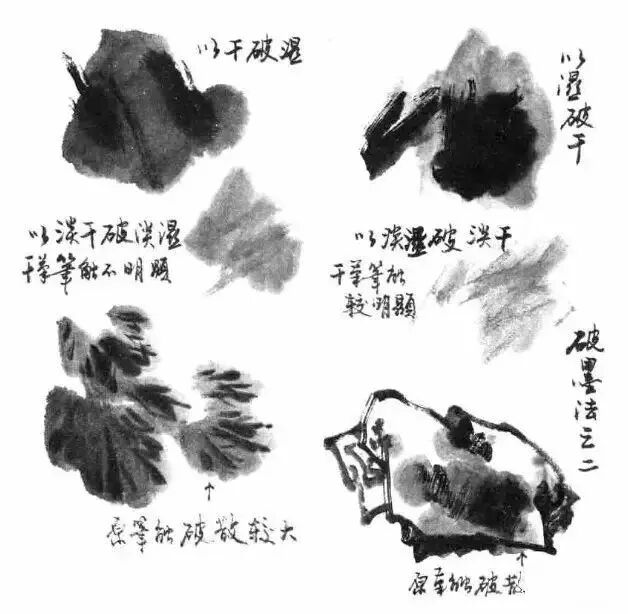 破墨:通过墨与墨的冲撞、渗化,使原来的墨迹产生新的变化。具体方法有以浓破淡、以淡破浓、以干破湿、以湿破干。