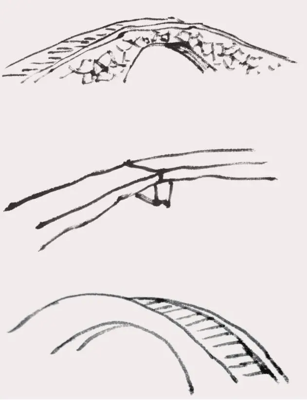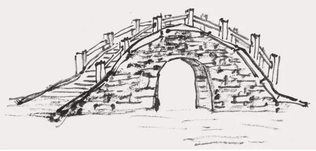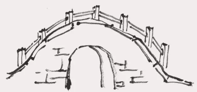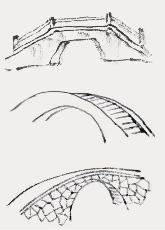 与木桥的原理相同,石桥的桥面是由石块拼接而成的,与单薄的木桥相对重量感很强,因此墨线应较为硬挺且棱角分明。表现石桥的纹理时,不要将每一条线都勾勒出来,意到即可。