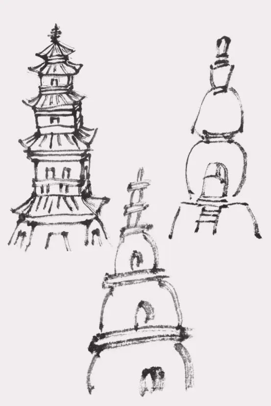 塔是一种常见的有着特定的形式和风格的东方传统建筑。塔身层层累积向上,因此呈细长状。由于它往往和佛教有关联,因此能为作品增添丝丝禅意。
