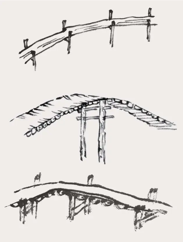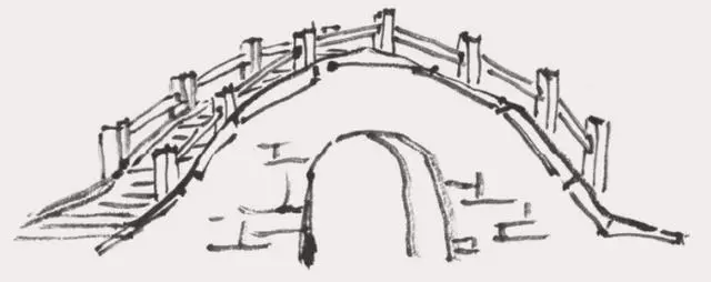 木桥是建造桥梁时以木扳为原料的桥,结构相对简单。因此,绘制时墨线不宜过于粗糙,要表现出木板光滑的质感。