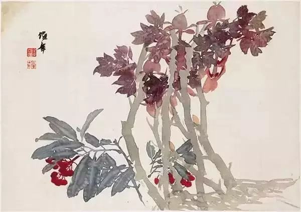 叶子也是如此,除了成叶外也要有嫩叶及嫩芽,并注意阴阳向背,大小穿插。枝干也要有主干 、支干之分,以及在画面上的姿态和疏密。