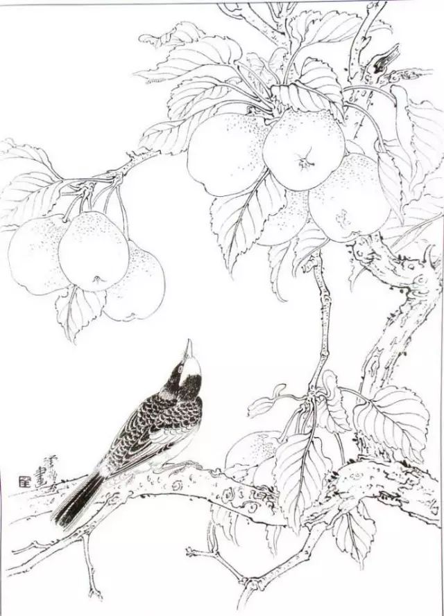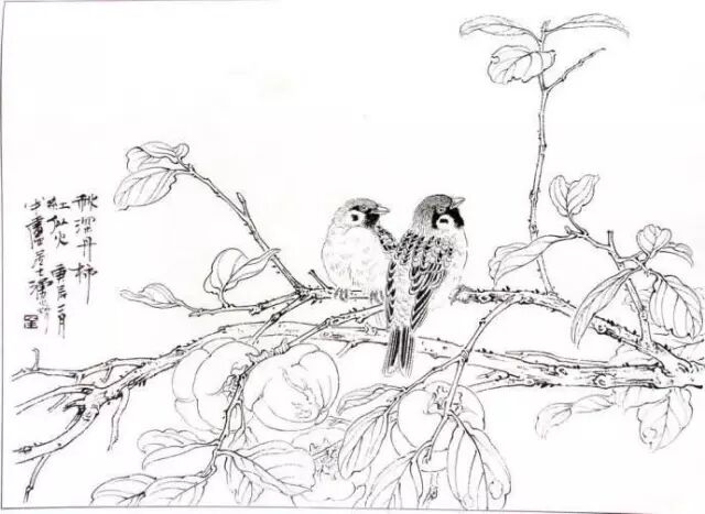 画鸟的顺序是先画嘴的当中一长笔,再画上颚和下颚各一笔,再依次画眼圈、点眼、头额、背、翼、胸、腹、腿、爪、补尾。画细毛的线条落笔与收笔较轻,中段略粗,若落笔太重,不易表现出羽 毛的质感。