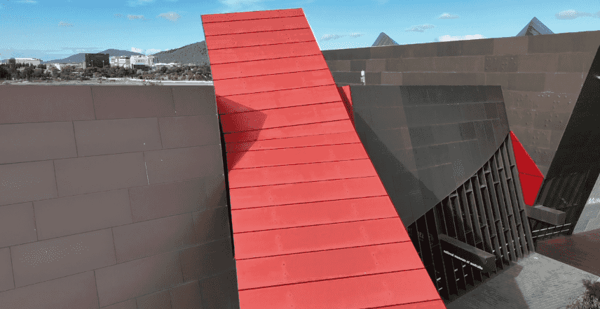 An arresting and interactive 70 metre ‘Welcome Wall’ of reflective curved stainless steel leads visitors towards the Museum, while marker plaques on the cobbled path point towards significant Aboriginal sites.