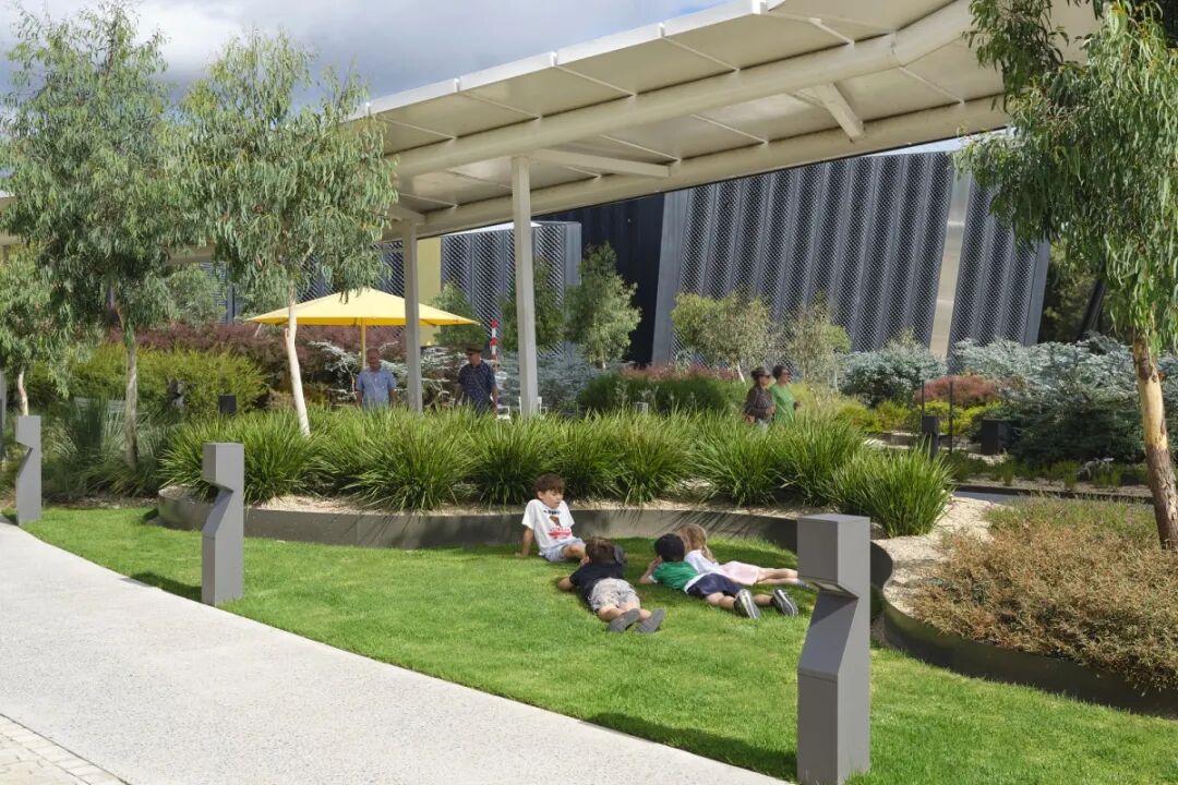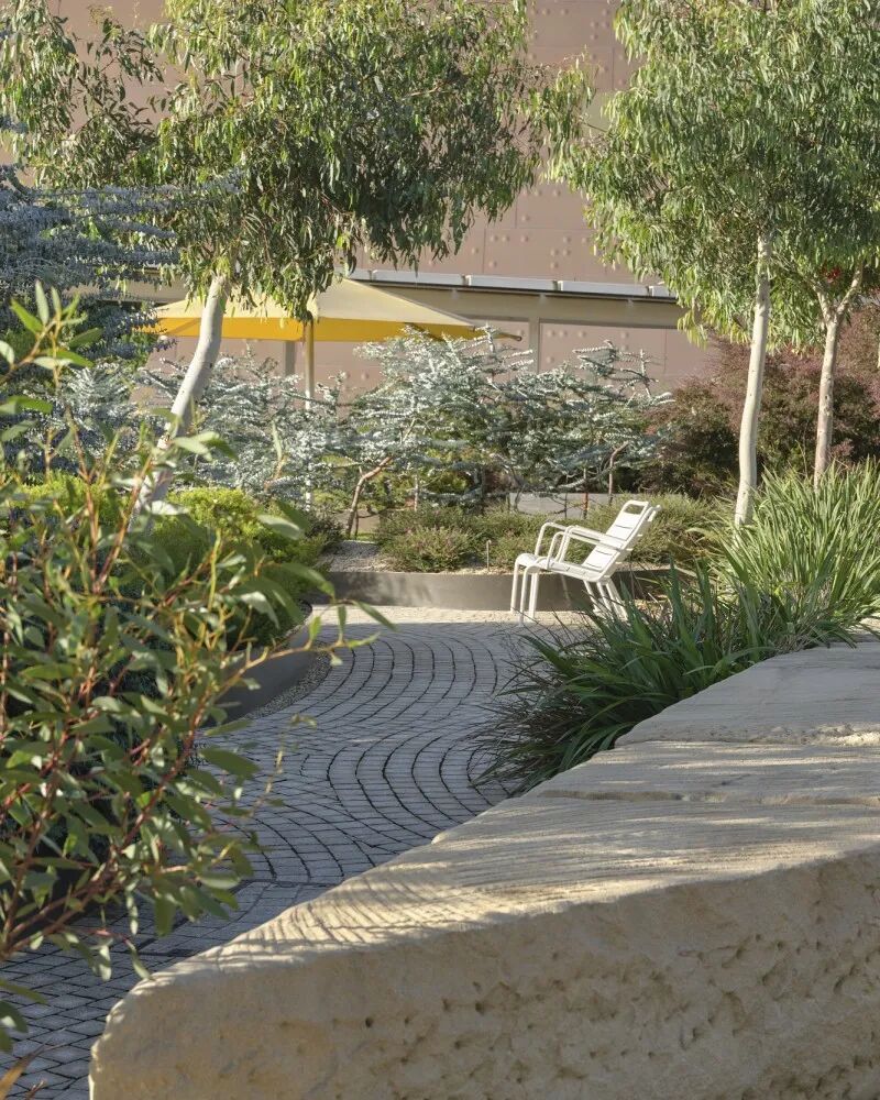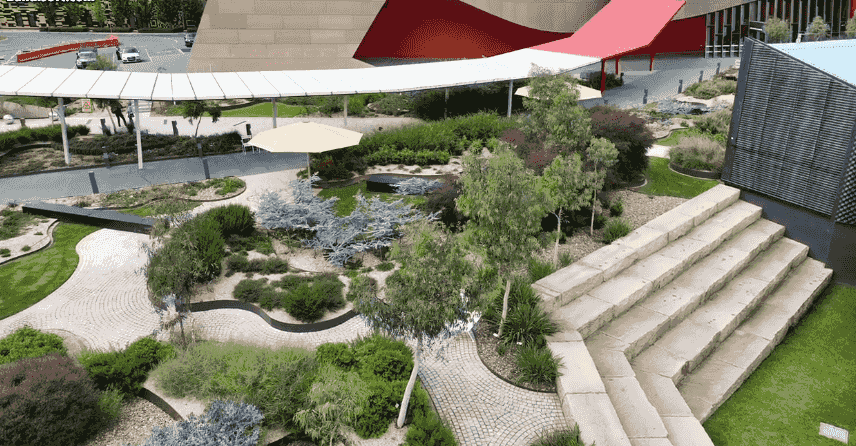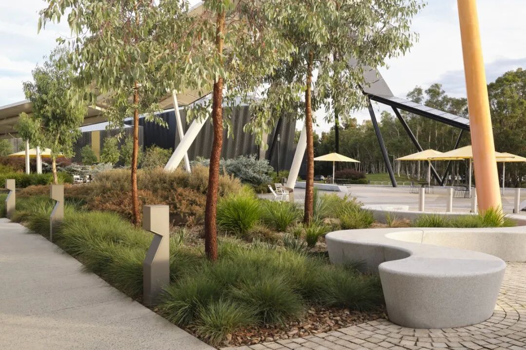 The amorphic forms of the garden are inspired by the Aboriginal practice of Fire Stick Farming where mosaic patterns are formed from intermittent low intensity burning.
