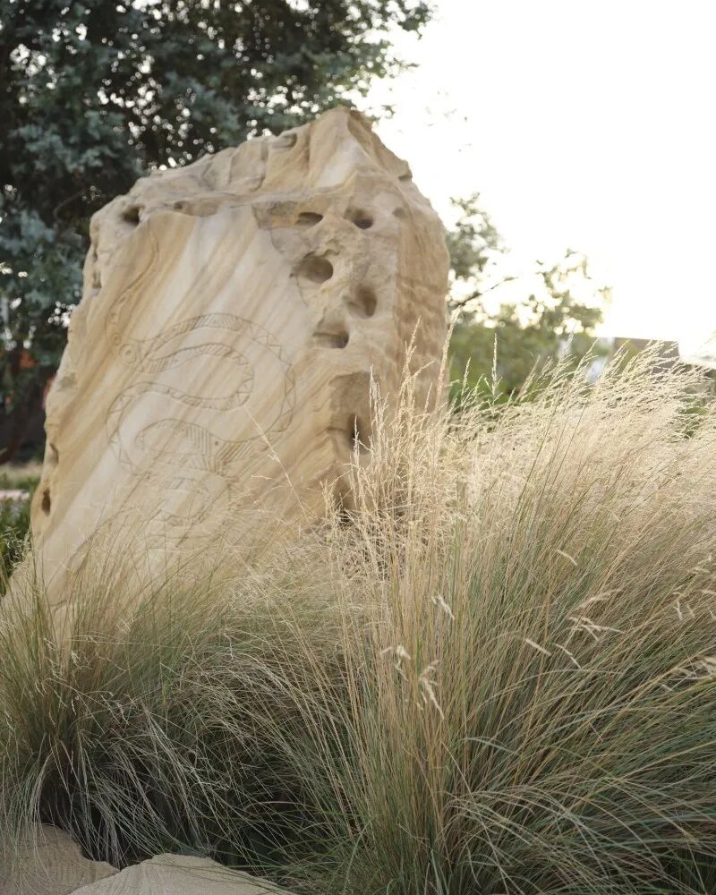 "Welcome to Country "的序列开始于前院的入口处,其中有一个由当地原住民艺术家雕刻的当地砂岩花园。