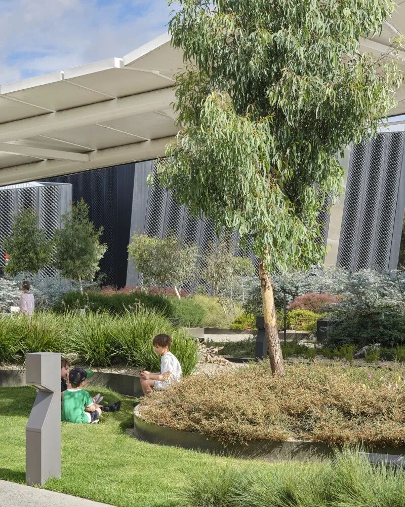 前院包含一系列身临其境的、信息丰富的、聚集的和感官的空间,包括一个由澳大利亚本土植物组成的 "马赛克花园",适合堪培拉干热的夏季和寒冷的冬季而充满挑战性环境。