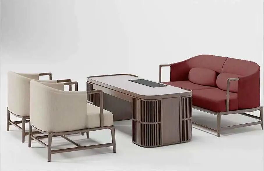 沙发设计取自明南官帽椅,鹅脖竖枨造型,结合现代软体沙发的制作工艺而成,既体现明式家具的灵动、婉柔之美,又彰显现代审美的时尚情趣。