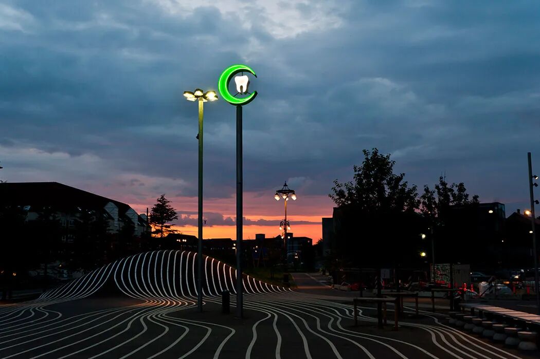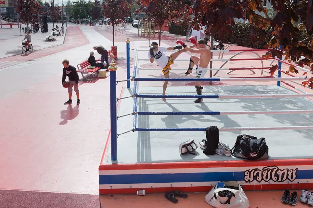 The furnishing and equipment of Superkilen will be a compilation from an international catalogue of elements, including international billboards and light-advertisement. The flashing neon advertisement for a Japanese pachinko parlour astonishes, while telephone cells from Latinamerica create the flicker of an illusion of a beach promenade.