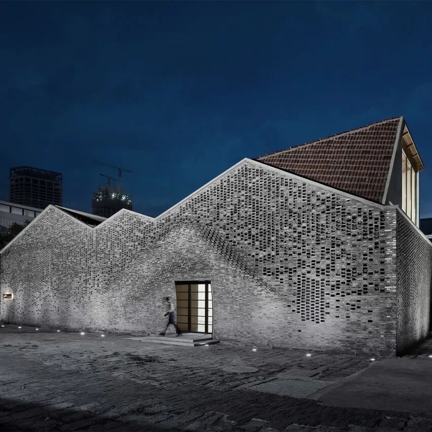 这个200平方米的画廊占据了位于上海西岸地区的一个旧仓库,建筑师使用从拆除建筑物中回收的青灰色砖块为建筑建造了第二个围护结构。这种新砌体墙的三维几何图形是在计算机上设计的,并使用移动机器人系统在现场制作。