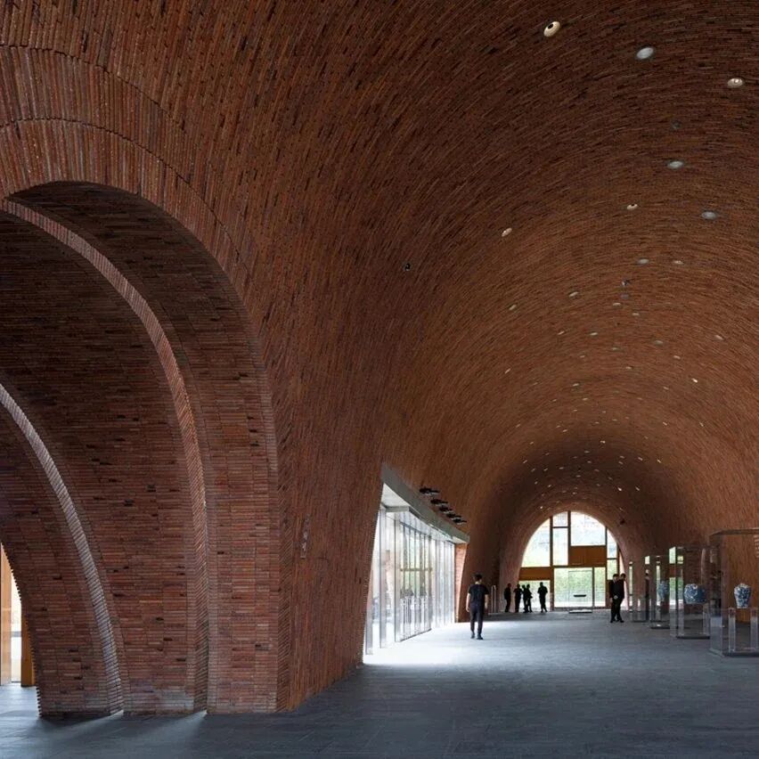 这座博物馆由朱培工作室设计,位于景德镇的历史中心,被誉为中国的“瓷都”。它包括一系列拱形结构,由新烧制的红砖和从旧熔炉中回收的其他砖混合而成。这些拱形结构收藏了博物馆的藏品,并参考了传统砖窑的形式,其中许多仍然在附近发现。