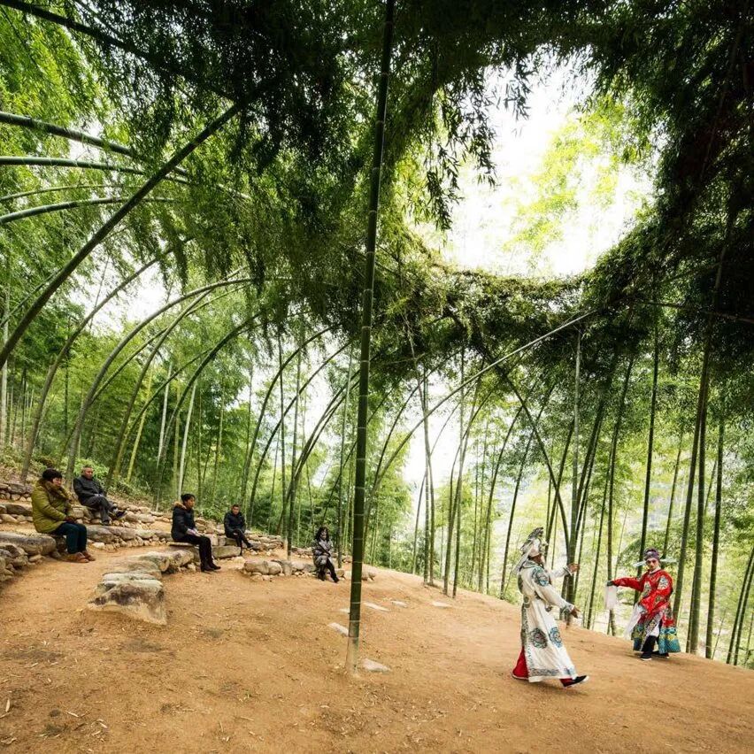 竹剧场是在恒坑村附近通过将竹子弯曲和缠绕成圆形排列形成圆顶天篷而创建的表演舞台。它是DnA创始人徐甜甜在松阳县长期乡村振兴计划的一部分,她为此设计了数十种可逆的建筑干预措施,她称之为“建筑针灸”。