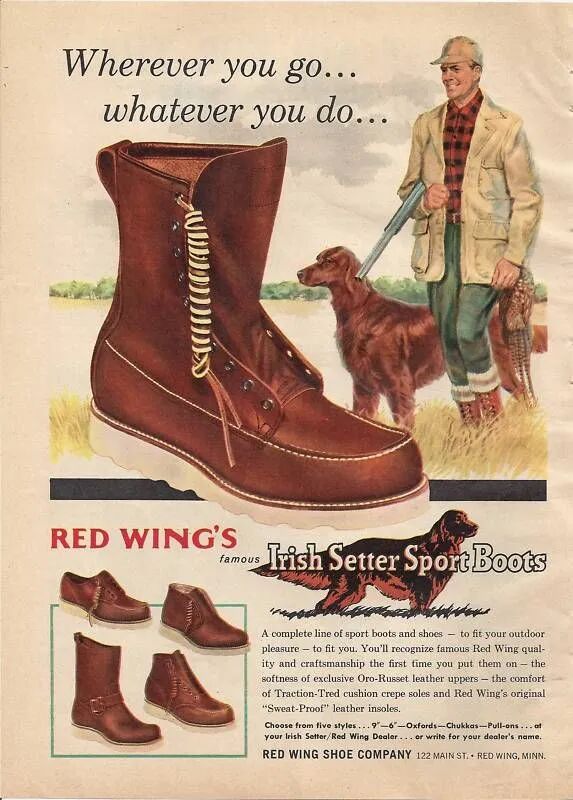 而从 REDWING 爱尔兰塞特犬标的出现,也能看出当时的社会风气,以及 REDNWING 品牌定位的转变。由于 1950 年代战后社会开始重建,欣欣向荣的各行各业,与人民的安居乐业,让品牌 REDWING,也开始将生产颇具功能性的户外鞋履,作为了自己的主业,而这也成为品牌日后历史上,颇为辉煌与灿烂的一页。