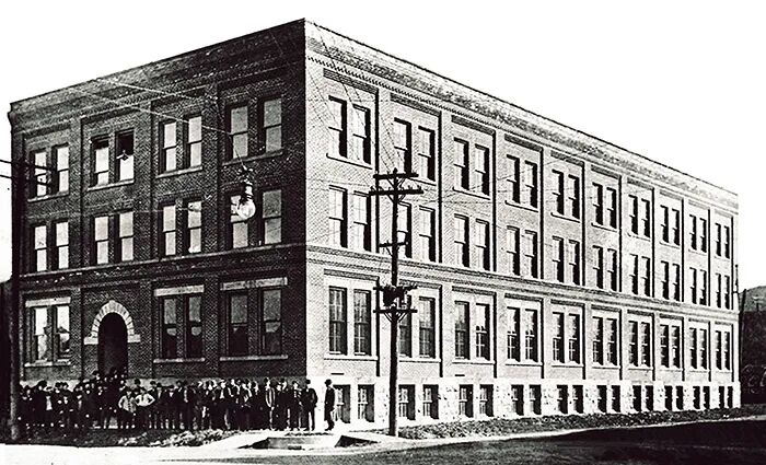 1908 年时,REDWING 的工厂外观,以及车间处理工作台前端