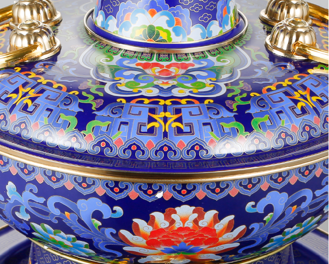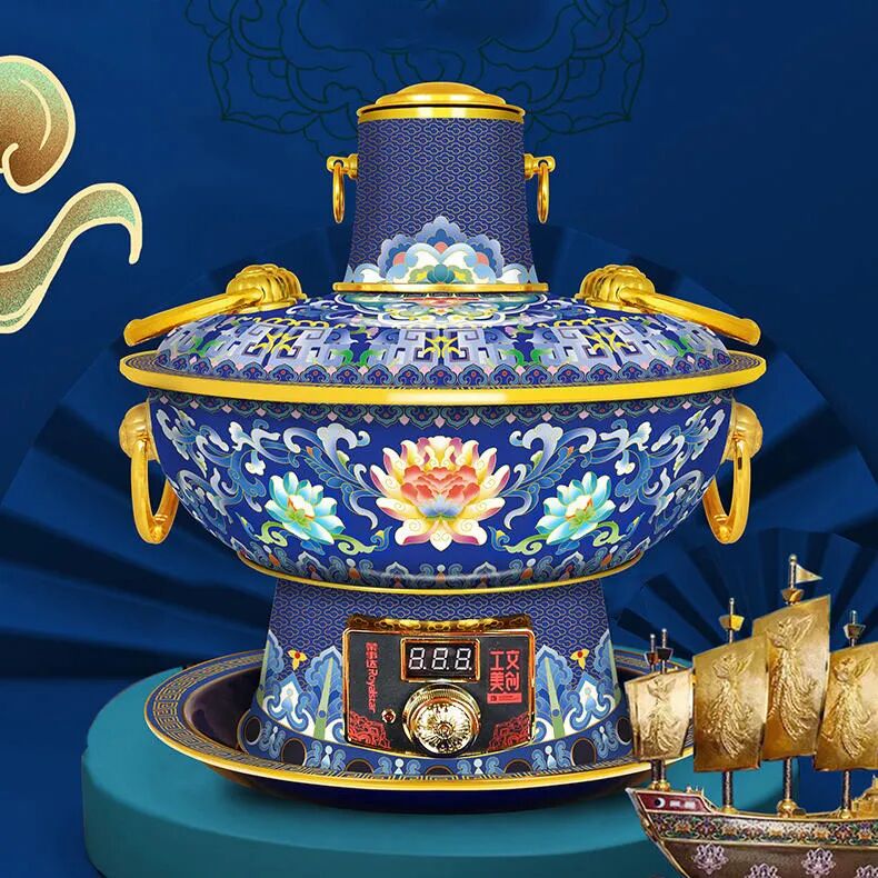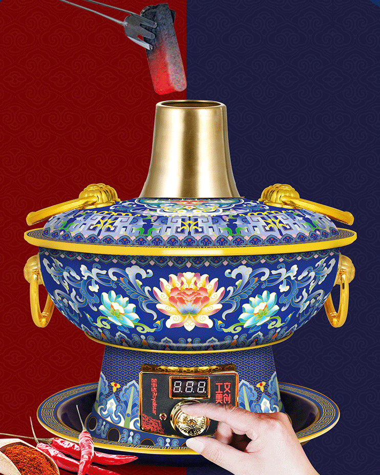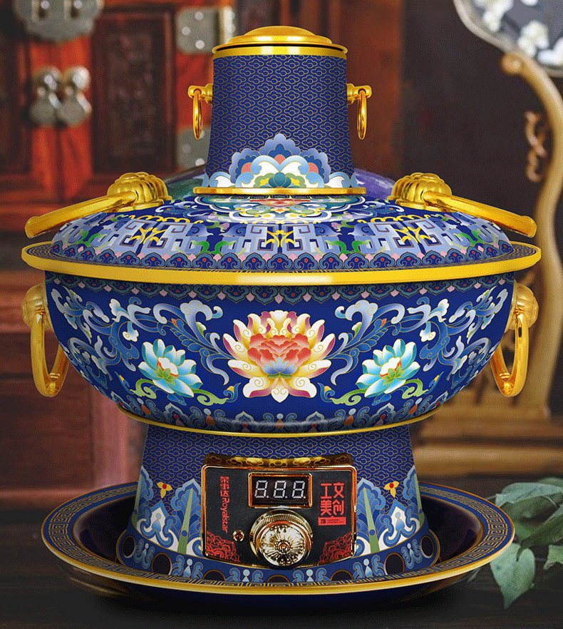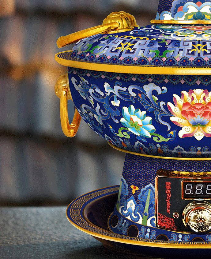 花开盛世·景泰蓝纹饰电火锅还摒弃了现代冶炼的不锈钢材质,采用了传统皇家造办规制,通体加厚黄铜打造。