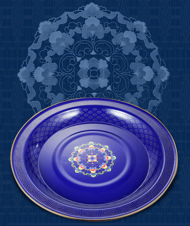 “花开盛世,染一程芬华,撷一缕国色”,设计纹样来源于赠送给英女王伊丽莎白二世的景泰蓝国礼《友谊之船》