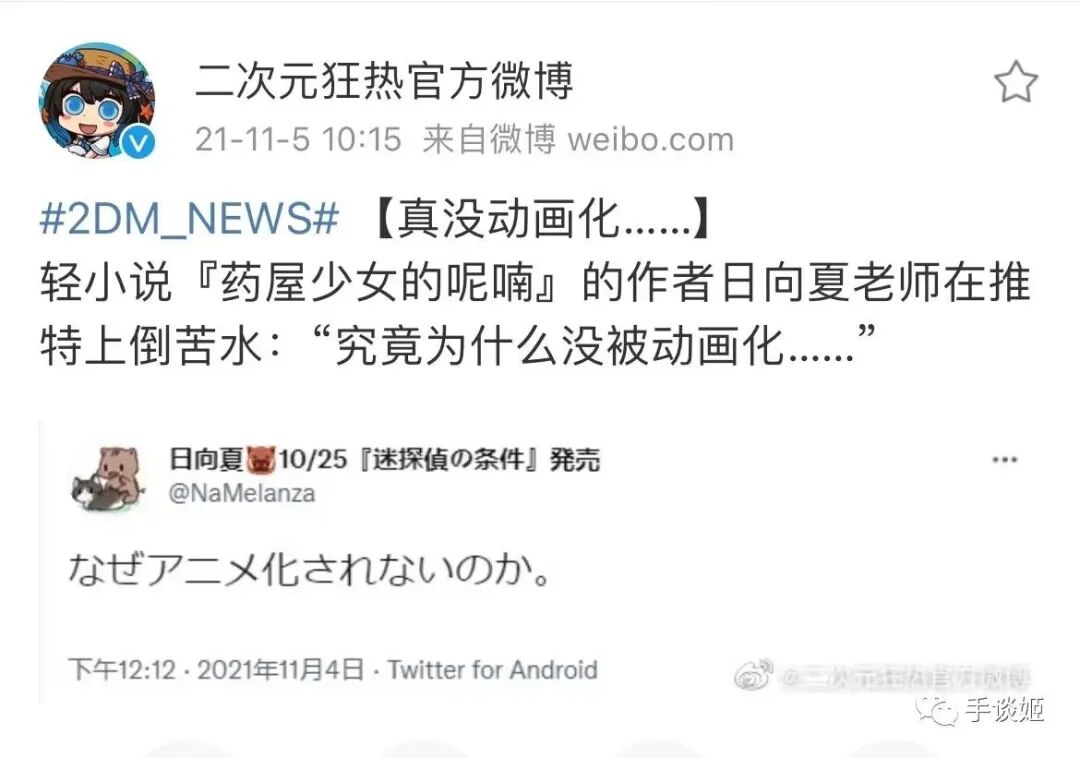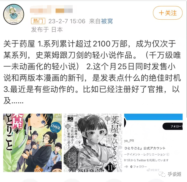 本日2月16日早9点,人气作品《药屋少女的呢喃》宣布了动画化决定,有说法是这是人气轻小说作品中唯一一部还没有动画化的小说了。