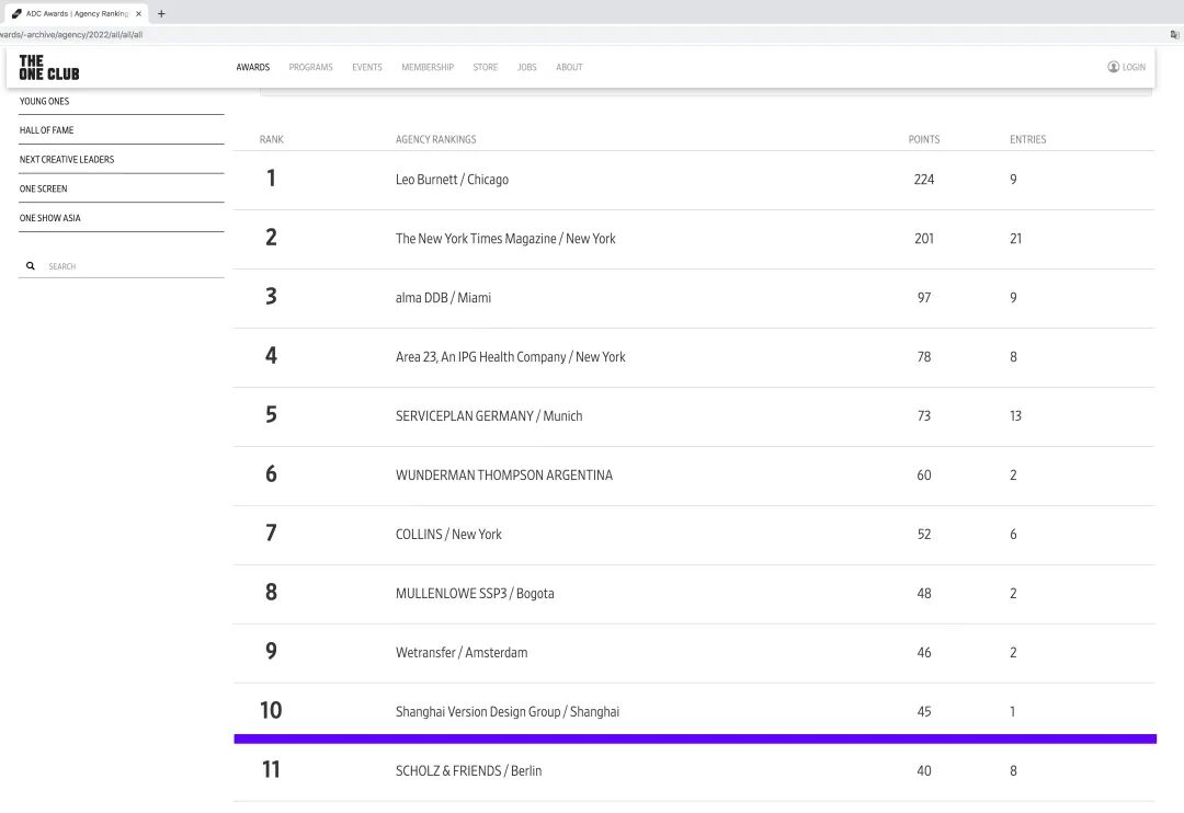在今年的纽约ADC年度设计公司排名中,悟形VDG挺进全球Top 10,也是今年唯一一家进入全球10强的亚洲设计公司。
