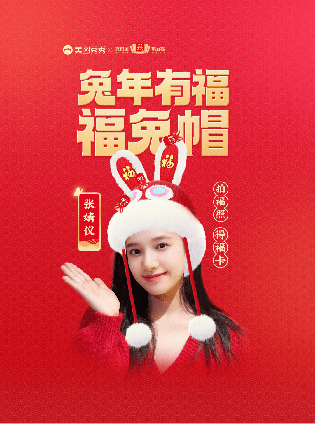 近日,支付宝与美图秀秀合作开启集五福新玩法,打开美图秀秀-相机-萌拍-精选,搜索「兔年有福」/「张口有福」即可打卡张婧仪同款。此外,美图秀秀还上线了定制新年福气贴纸AR,使用特效拍摄照片后,可以使人像戴上福气帽,拍出福气照,还有指定「福气弹窗」弹出。(美图秀秀)