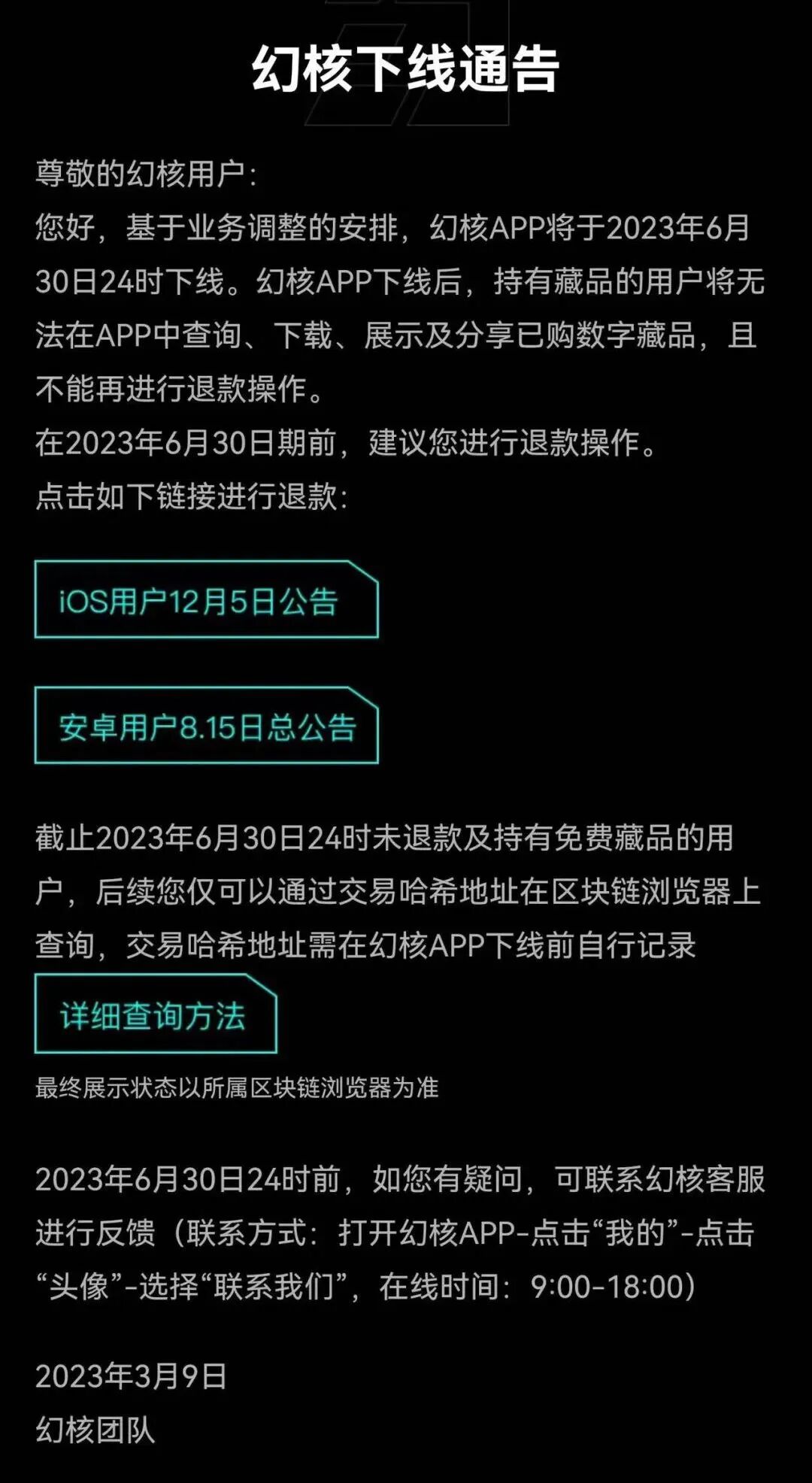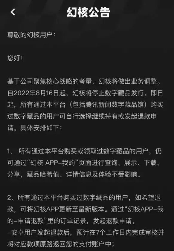 这是继幻核2022年8 月 16 日起停止数字藏品发行,并接受用户退款之后又一动作。