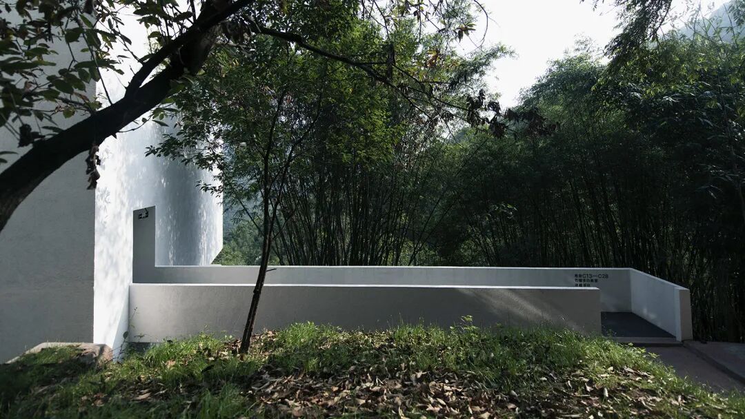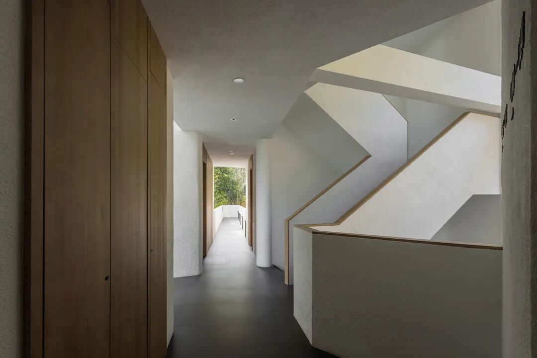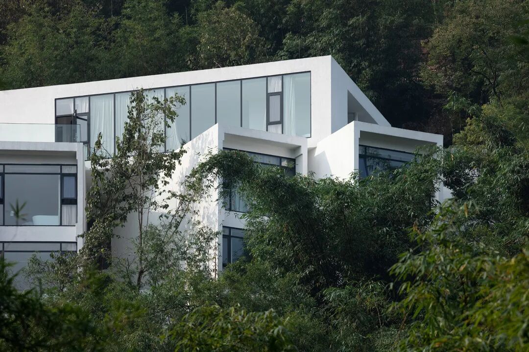 通过泳池下方的过道,经过餐厅,穿过一片竹林就能看到一栋置身竹林之中的白色建筑,它是一栋坡地建筑,也是形式与功能相结合的房子。