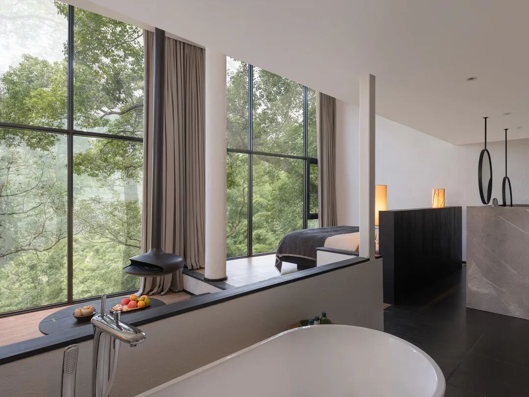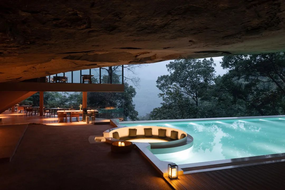 这里也是去往客房、泳池、餐厅还有冥想空间的一个交汇点和停留点。在泳池的上方是洞穴的第二条瀑布,瀑布营造独特的就餐环境,潺潺流水,与泳池相呼应。餐厅的户外平台,人与水近距离接触,听着林涧鸟语,感受细水长流……