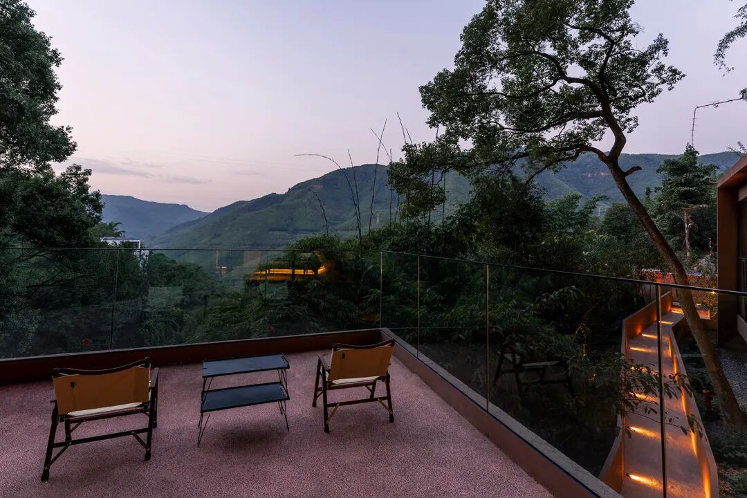 洞穴酒店的设计就像一道填空题,由于洞内独特的进退关系结构,采用了不同形状的体块去填空,体块高低错落有节奏的组合摆放,形成了独特的空间关系。建筑色彩也契合丹霞地貌的特征。洞穴中天然圆形的空间,具有洞穴的特征和力量感,将此处作为大堂前台,天方地圆,浸透着中华民族先民最朴素的哲学,在这里能遇见第一个瀑布从断崖折流而下。