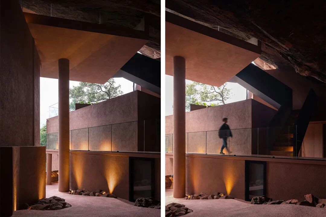 客房区域自然的洞穴岩壁与现代建筑的对话,两者协调的融合在一起,打破千篇一律的建筑感觉,融入凹凸不平富有肌理感的触感,形成了一个围合的空间,让体验者能和岩石有一个亲密独特的接触,当其置身于整个空间中,会迫不及待的探索空间的角角落落。